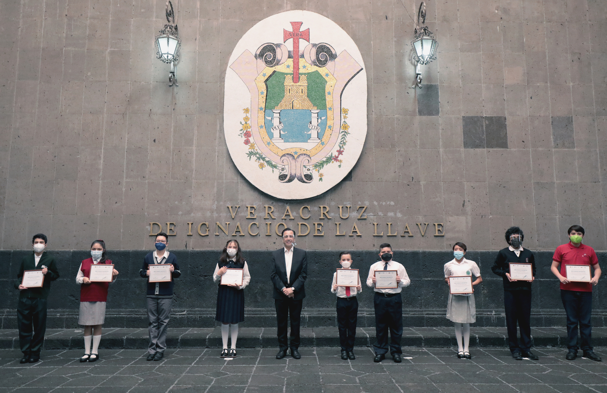 Xalapa, Ver., 02 de julio de 2021.- Este día, el gobernador Cuitláhuac García Jiménez se reunió con los nueve estudiantes que representaron a Veracruz en la Olimpiada Mexicana de Matemáticas para Educación Básica (OMMEB-2021), que tuvo lugar del 17 al 21 de junio de manera virtual. Al tiempo de destacar su esfuerzo y dedicación, pues afrontaron el reto de estudiar a distancia, el mandatario aseguró que la presente administración tiene el objetivo de innovar las formas de enseñanza, sobre todo si hay que inculcar el gusto por el conocimiento en la niñez y juventud. Acompañado por el titular de la Secretaría de Educación (SEV), Zenyazen Escobar García, y la subsecretaria de Educación Básica, Maritza Ramírez Aguilar, entregó reconocimientos a la alumna Zury Victoria Muñoz May, originaria de Poza Rica y preseleccionada a la Olimpiada Internacional de Matemáticas 2022.