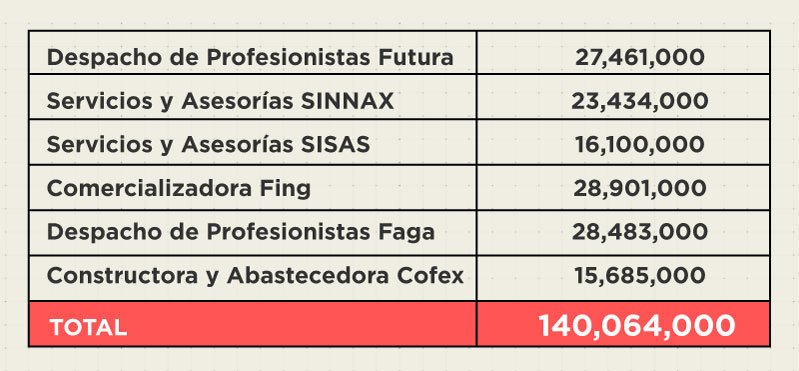 Esas seis empresas, a las que el gobierno de Pavlovich les transfirió fondos públicos, formaron parte de un presunto esquema de financiamiento ilegal de campañas electorales del PRI, conocido como Operación Safiro. En noviembre de 2018, una investigación de MCCI reveló que autoridades de siete estados habían participado en la Operación Safiro con el desvío de 650 millones de pesos a esta red de empresas fantasma. Puede revisar la nota completa al dar clic aquí. Esta información fue publicada por Mexicanos Contra la Corrupción y la Impunidad. |