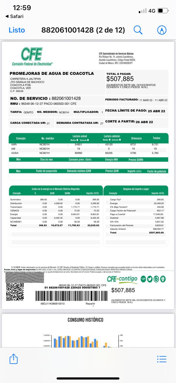 La deuda es de 507 mil 885 pesos, más del medio millón. Al parecer el alto costo de energía eléctrica se debe a una bomba de agua que distribuye el líquido de Jáltipan a Coacotla.