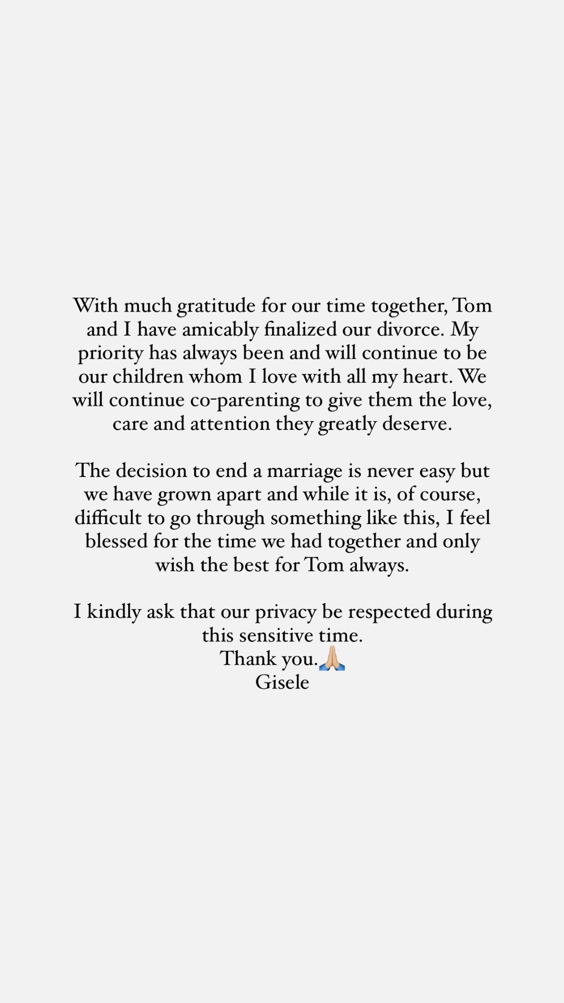 Luego de 13 años el mariscal de campo Tom Brady y su esposa la supermodelo Gisele Bündchen anunciaron la mañana de este viernes la formalización de su divorcio. La pareja compartió un anuncio, cada uno en sus historias de Instagram en donde compartían con sus seguidores que habían decidido poner fin a su matrimonio, decisión a la que llegaron amistosamente. Gisel por su parte expresó la gratitud y el apoyo hacia su expareja: "Con mucha gratitud por nuestro tiempo juntos, Tom y yo hemos formalizado amistosamente nuestro divorcio. Mi prioridad siempre fue y será nuestros hijos a quienes amo con todo mi corazón.", escribió Bündchen en Instagram y afirmó que ambos compartirán el cuidado de sus hijos. "La decisión de finalizar un matrimonio nunca es fácil, pero nos hemos distanciado y con ello, por supuesto, es difícil pasar por algo así. Me siento bendecida por el tiempo que pasamos juntos y solo deseo lo mejor para Tom siempre", señaló la brasileña de 42 años.