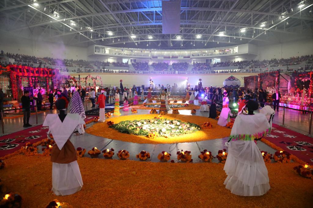 Xalapa, Ver., 30 de octubre de 2022.- Con el Altar del Día de Muertos más grande del mundo de los pueblos originarios, el Gobierno estatal, a través de la Secretaría de Educación de Veracruz (SEV), celebra la lengua y cosmovisión de 10 culturas vivas para promover con orgullo la interculturalidad entre la población que podrá conocerlo desde este domingo y hasta el 02 de noviembre, en el Velódromo de Xalapa. La instalación reúne la tradición de los tutunakú, tének, nawatl, lhimasipij, chinantecos, zoque popoluca, mixe popoluca, mazatecos, hñähñü y zapotecos en una extensión de mil 502 metros cuadrados, luciendo 20 toneladas de cempasúchil y mano de león; media tonelada de tamales, frutas, bebidas y pan; mil 204 velas y 208 cañas de otate, con la participación de 603 personas.