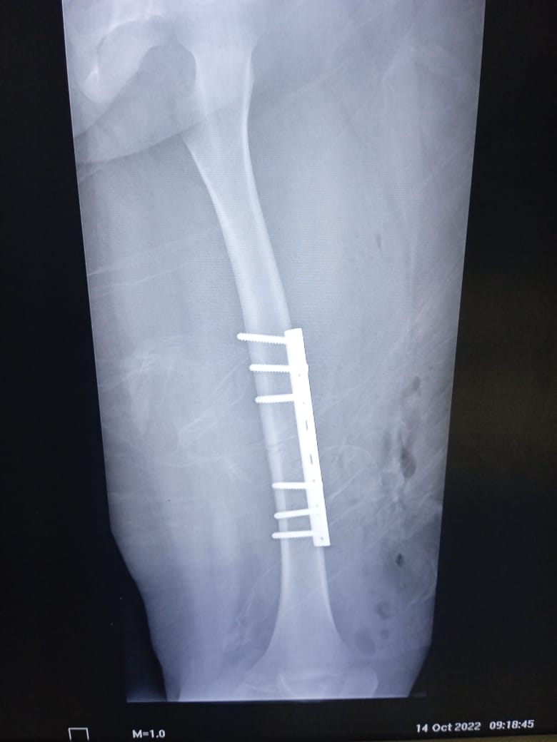 | Fue necesaria la colocación de placa y seis tornillos en la pierna izquierda |