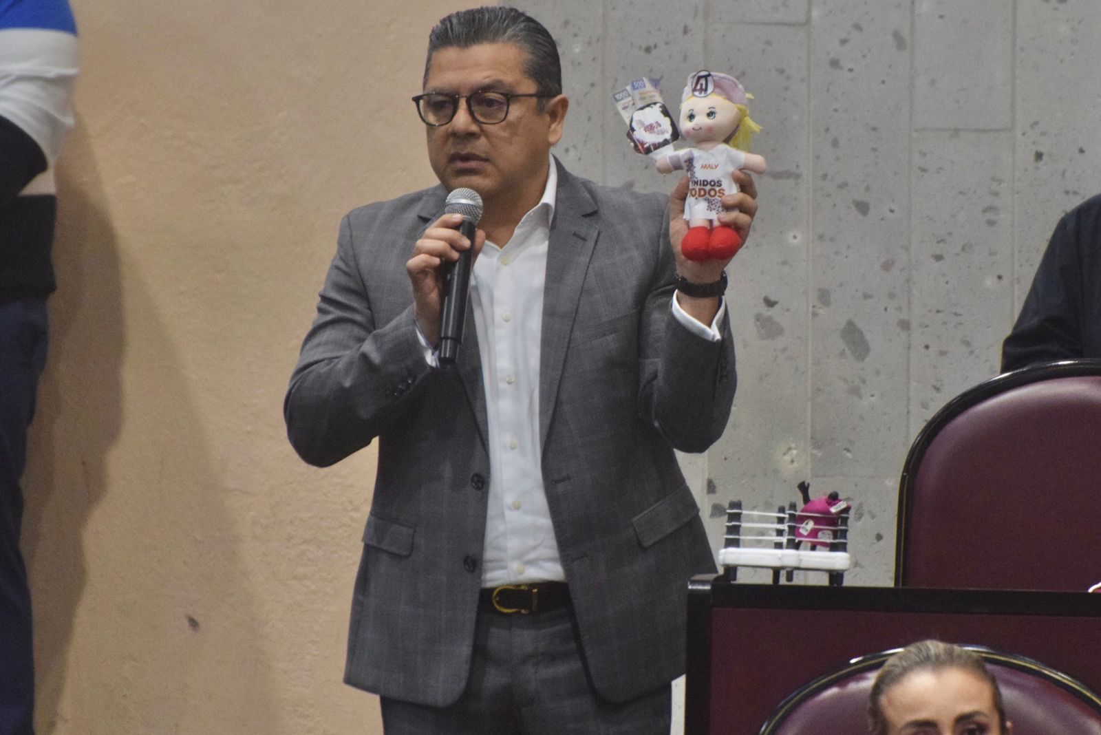 "Sabía que no me iba a decir usted quien es Araly Rodríguez Vez", dijo el Diputado mientras parodió mostrando con un ring de lucha libre que representó a Veracruz, y dos luchadores, uno pequeño que simbolizó al SEA, contra una luchadora grande simulando a Araly Rodríguez, la funcionaria que tiene más de 100 millones de pesos en contratos en distintas dependencias del Gobierno del Estado, la situación de corrupción en la entidad. "Maestra, no es que vaya uno a la vanguardia, pero de qué sirve el esfuerzo del Sistema Estatal Anticorrupción, cuando alguien, no sé quién, le ha entregado a una señora contratos por cien millones de pesos, ni los salarios de todo el auditorio junto aquí reunido al año alcanza esa cifra", agregó.