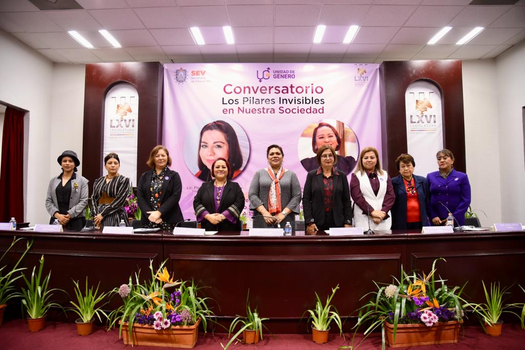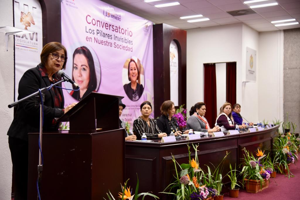 En su participación durante el conversatorio Pilares invisibles de nuestra sociedad, la presidenta de la Mesa Directiva de la LXVI Legislatura del estado de Veracruz, diputada Margarita Corro Mendoza, enfatizó que no debe retrocederse ni un centímetro en la exigencia de tratar a las mujeres con dignidad y respeto, así como en la defensa de los lugares que han logrado en los últimos años. En este encuentro, organizado por la diputada Adriana Esther Martínez Sánchez y la titular de la Unidad de Género de la Secretaría de Educación de Veracruz (SEV), Florencia Martínez Rivera, la legisladora Margarita Corro subrayó que en el marco del Día Internacional de la Mujer, es fundamental recordar que la voz de las féminas es crucial para la consolidación del bienestar y progreso social en cualquier sociedad.