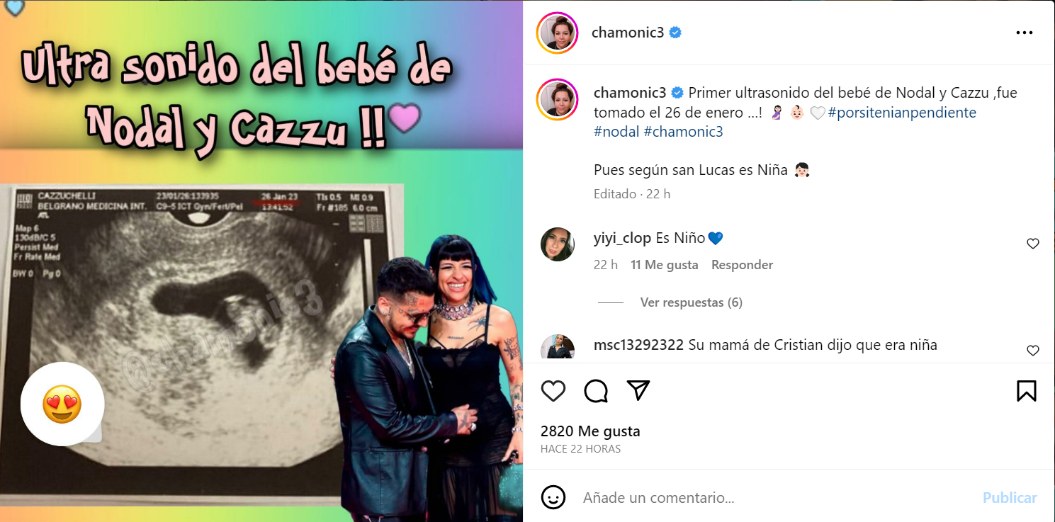 "Primer ultrasonido del bebé de Nodal y Cazzu , fue tomado el 26 de enero …!". Posterior al anuncio de la argentina, Nodal también confirmó con emoción la noticia durante uno de sus conciertos: "Quiero darles la noticia que ya no soy un papacito; ahora sí soy un papá", dijo con emoción. |