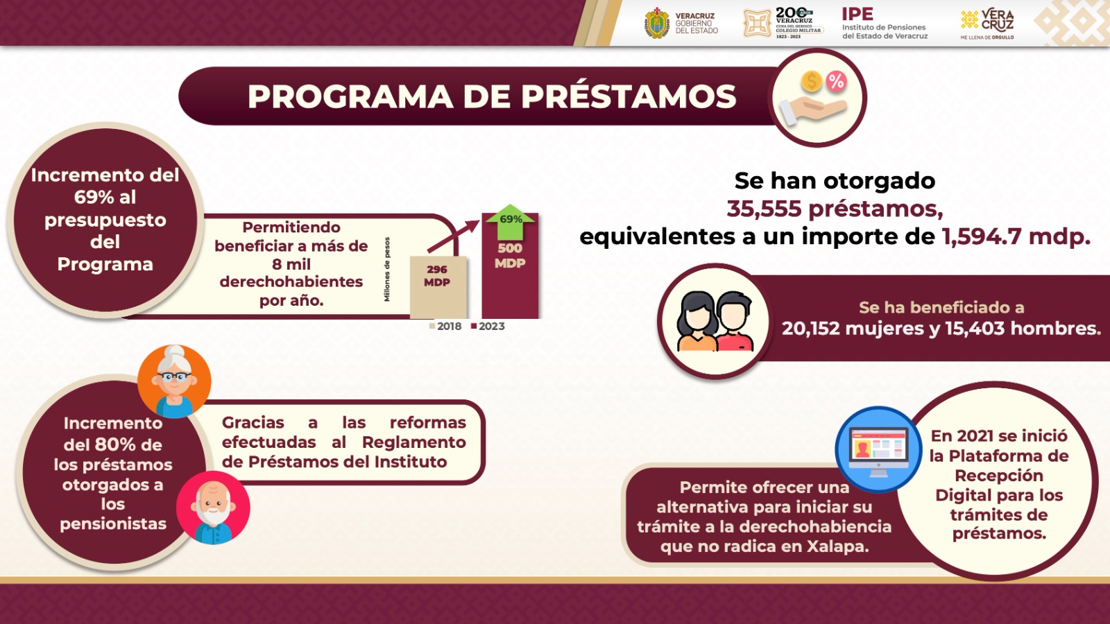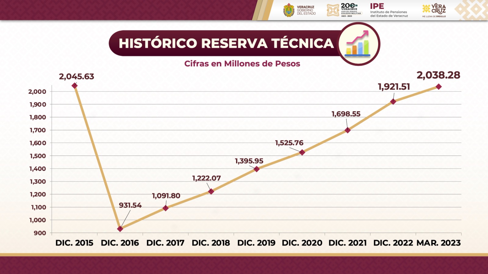 Xalapa, Ver., 27 de abril de 2023.- El Instituto de Pensiones del Estado (IPE) rebasó la meta establecida el año anterior y, al corte de marzo, el Fideicomiso de la Reserva Técnica cuenta con 2 mil 038 millones de pesos, un incremento del 63 por ciento respecto a 2019, informó su directora Daniela Guadalupe Griego Ceballos al gobernador Cuitláhuac García Jiménez. Desde el rehabilitado foro cultural Carmela Rey, explicó que, derivado de la implementación de estrategias como la diversificación de inversiones, sumado al buen manejo de las finanzas, los 132 mil 762 derechohabientes activos y pensionados reciben puntualmente las prestaciones y demás beneficios. Una de las razones del crecimiento histórico en los fondos es el buen funcionamiento del Programa de Préstamos, el cual aumentó 204 mdp (69%) desde 2018, mediante la obtención y transferencia de rendimientos.