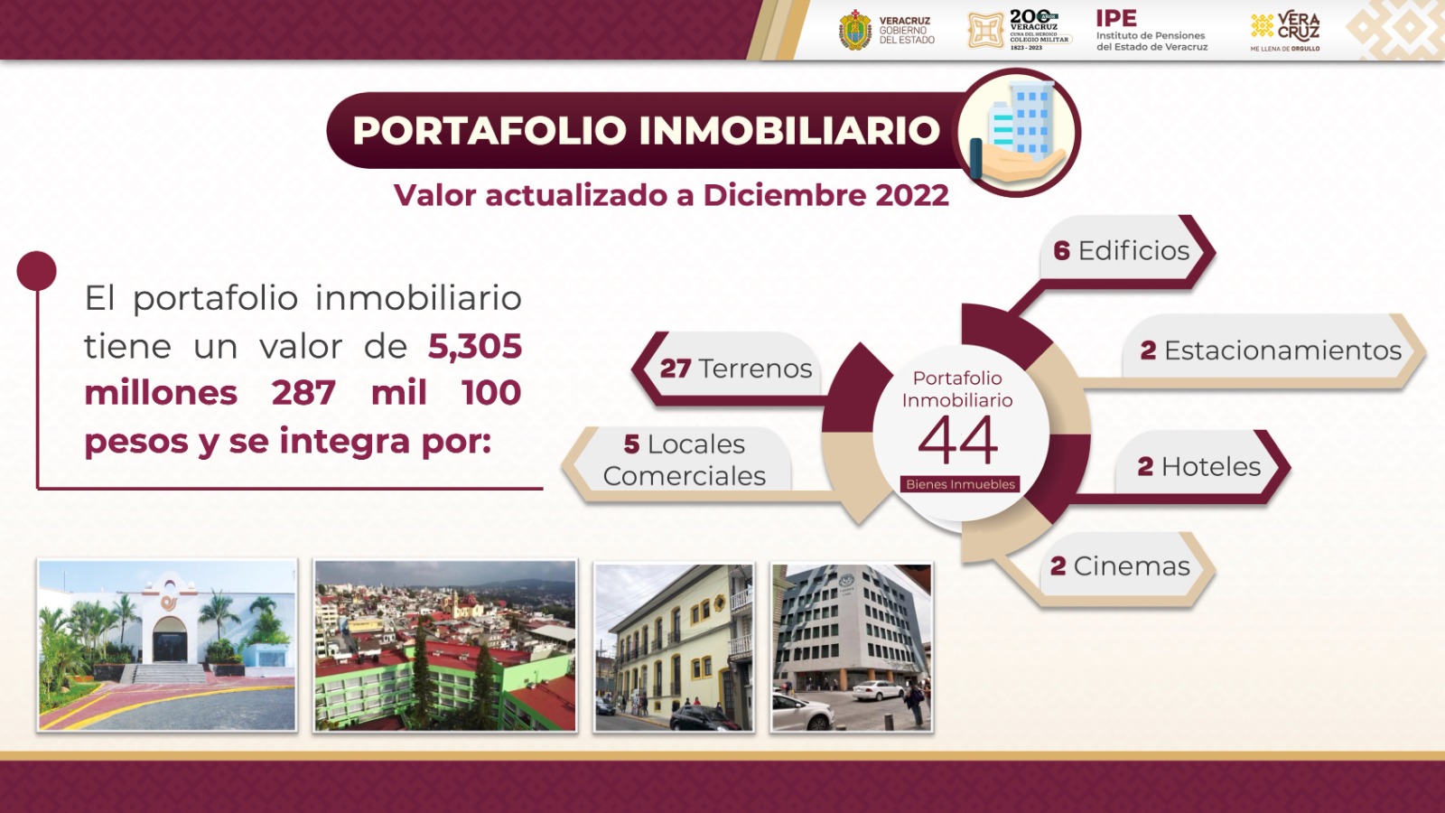Actualmente el IPE cuenta con un portafolio de 44 inmuebles valuado en 5 mil 305 millones 287 mil 100 pesos, 800 millones más del valor en lo que va de esta administración; aquí se contemplan 27 predios, seis edificios, cinco locales comerciales, dos estacionamientos, dos hoteles y dos cines.
