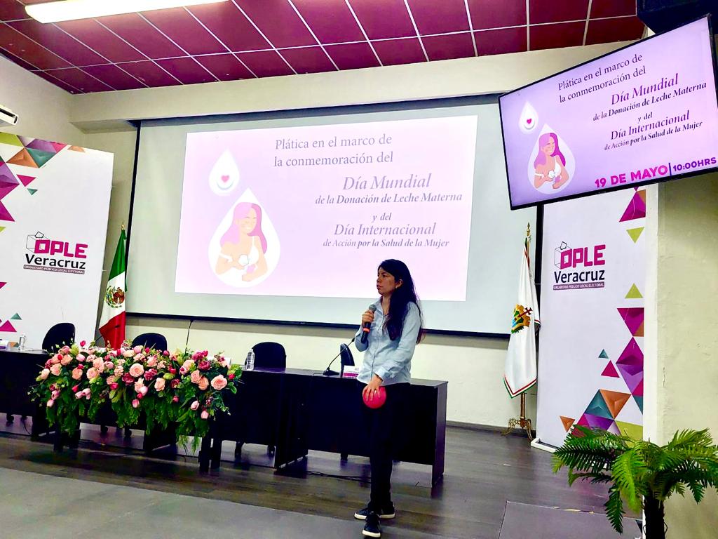 Xalapa, Veracruz, 19 de mayo de 2023. En el marco de la conmemoración del Día Mundial de la Donación de Leche Materna y del Día Internacional de Acción por la Salud de la Mujer, a través de la Comisión Permanente de Igualdad de Género y No Discriminación del Organismo Público Local Electoral del estado de Veracruz (OPLE), se impartió la plática sobre la importancia de la lactancia materna con el fin de incentivar esta actividad. Dicho evento fue organizado por la Unidad Técnica de Igualdad de Género e Inclusión por instrucción de la presidenta de la Comisión antes mencionada, Mabel Aseret Hernández Meneses, en donde estuvieron presentes las Consejeras Electorales, Maty Lezama Martínez y María de Lourdes Fernández Martínez.