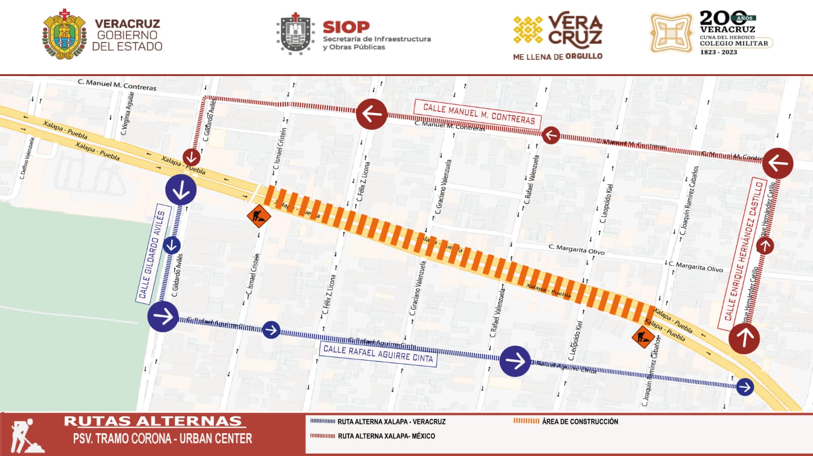 Xalapa, Ver., 09 de junio de 2023.- La construcción del segundo Paso Superior Vehicular incluido en el Plan B de vialidad para la capital del estado iniciará en 15 días, anunció el gobernador Cuitláhuac García Jiménez al presentar las rutas alternas que habrán de permitir un tráfico fluido en la zona de la Plaza Urban Center, en la colonia Rafael Lucio. Acompañado por el secretario de Infraestructura y Obras Públicas, Elio Hernández Gutiérrez, y el alcalde Ricardo Ahued Bardahuil, dijo que la circulación resultará más sencilla porque previamente fueron rehabilitadas en concreto hidráulico y la debida señalización las calles y avenidas a utilizar, mientras que el colector pluvial Hernández Castillo se encuentra ya en funcionamiento. Las desviaciones quedarán de la siguiente manera: quienes viajen en dirección Veracruz-México podrán tomar Enrique Hernández Castillo, pasando el puente Miguel Alemán, y a dos cuadras girar a Manuel M. Contreras hasta topar con Gildardo Avilés y de ahí regresar a Lázaro Cárdenas, frente al centro comercial.