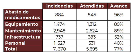 Ciudad de México, 18 de julio de 2023.- Como resultado de las 392 visitas de supervisión realizadas por el director general, Pedro Zenteno Santaella, el Instituto de Seguridad y Servicios Sociales de los Trabajadores del Estado (ISSSTE) atendió cinco mil 695 necesidades de las siete mil 370 detectadas, lo que representa 77 por ciento de avance —hasta el 30 de junio— para concretar el fortalecimiento de unidades médicas en territorio nacional. El titular de la Dirección de Oficinas de Representación, Israel Antonio Acosta Ibarra, informó que se realizan recorridos de seguimiento para verificar la resolución a las incidencias detectadas. Personal de las oficinas de representación del ISSSTE en las entidades federativas ejecuta las acciones necesarias para solventarlos; posteriormente, se integra un grupo de trabajo multidisciplinario, responsable de supervisar. El subcoordinador de Enlace Institucional, José Salvador Núñez González, puntualizó que, conforme a las cinco acciones prioritarias indicadas por el presidente Andrés Manuel López Obrador y el director general del ISSSTE, se verificó el funcionamiento de las instalaciones, constatando que desde las oficinas de representación se siguen las instrucciones, con lo cual se fortalece la capacidad resolutiva del Instituto. Actualmente, se registran los siguientes progresos en las unidades visitadas por el director general:
