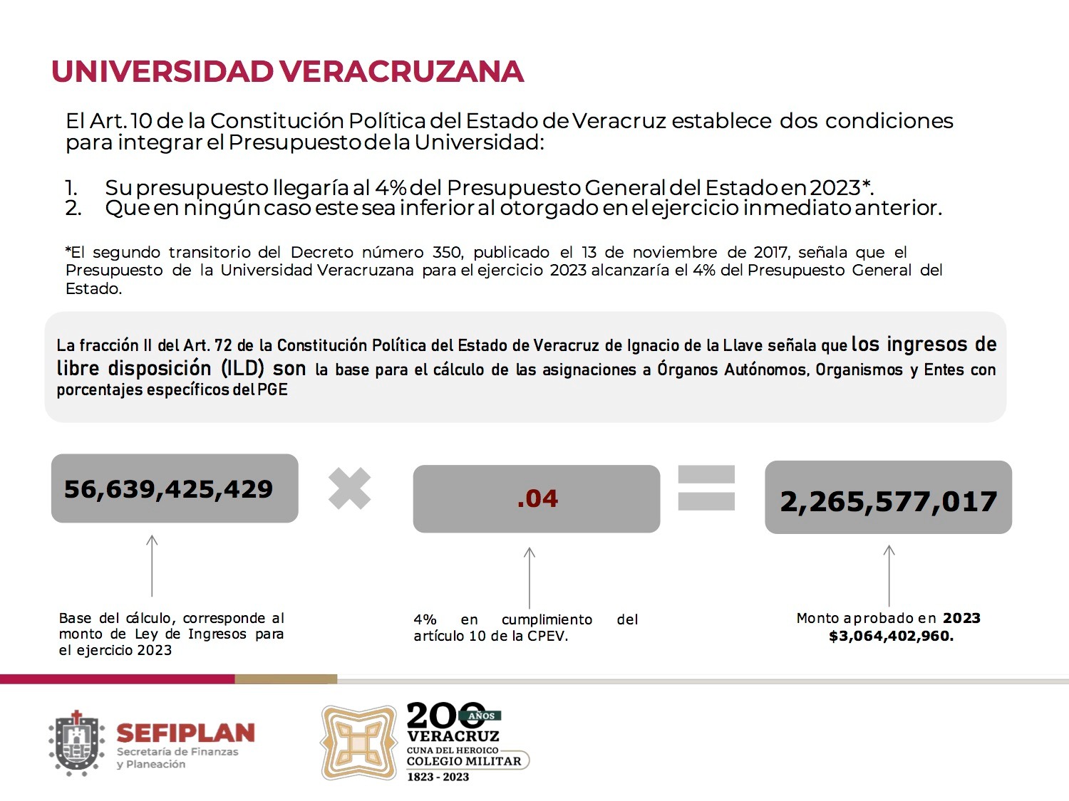 Xalapa, Ver., 27 de septiembre de 2023.- A nivel nacional, la Universidad Veracruzana (UV) es la única institución estatal de educación superior sin deuda, expresó el gobernador Cuitláhuac García Jiménez al informar que la administración ha cubierto el presupuesto en mayor medida de lo que indica la ley, que es del 4 por ciento. Dado que existen dos interpretaciones sobre el financiamiento, explicó que la operación obedece a la Fracción II del Artículo 72 de la Constitución Política del Estado, la cual establece que los Ingresos de Libre Disposición son la base para el cálculo de las asignaciones a órganos autónomos con porcentajes específicos del Presupuesto General. Es decir, del monto de la Ley de Ingresos estimado este año corresponden 2 mil 265 millones 577 mil 017 pesos a la máxima casa de estudios de la entidad, pero la cifra aprobada fue de 3 mil 064 millones 402 mil 960, con un recurso adicional de 403 millones 402 mil 960. “Encargué analizar el presupuesto para dar más de lo que ya hemos otorgado”, afirmó en conferencia de prensa, pues el Artículo 10 señala que no debe ser inferior al asignado el ejercicio anterior y que, aparte de un mandato oficial, se trata de un compromiso de convicciones y confianza en la Rectoría.