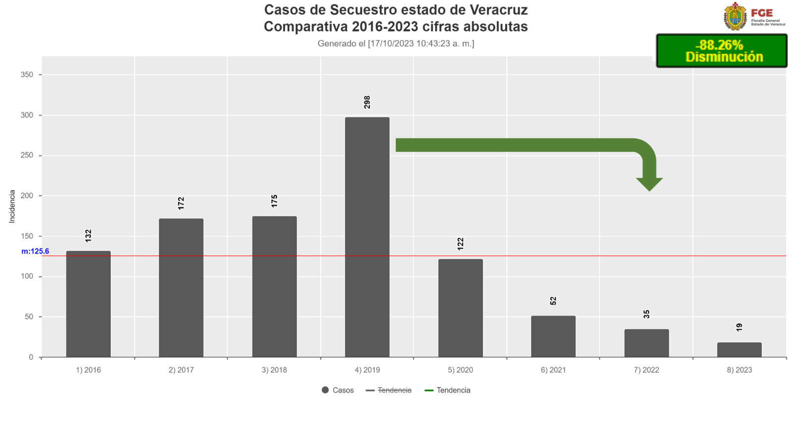 El siguiente reporte mensual del Sistema Nacional de Seguridad Pública muestra a Veracruz en decimotercera posición con 81 casos; es decir, de agosto a septiembre decrecieron los actos violentos, pese a las ejecuciones ocurridas en Poza Rica que captaron la atención de todos los medios del país. “Vamos bien y vamos disminuyendo; sí hay hechos lamentables pero el esfuerzo conjunto, de atención integral, va surtiendo efecto, producto de varios factores que hemos empujado”, dijo en referencia a los cambios de fondo en el Poder Judicial y la Fiscalía General del Estado (FGE). En este sentido, subrayó las más de 20 detenciones en torno al tema de Poza Rica, como parte del esquema Cero Impunidad y gracias al apoyo de las corporaciones que integran la Coordinación Estatal para la Construcción de la Paz, principalmente las del Gobierno de México. Asimismo, se da cumplimiento al compromiso de no rebasar los tres homicidios diarios, cuando las administraciones anteriores dejaron la cifra en ocho o más. Sobre el índice de secuestro, el mandatario reiteró la disminución del 88.26 por ciento entre 2019 y 2022, tras el cambio de titular en la FGE y luego de denunciar que el fiscal anterior no cumplía su función, aun teniendo a su disposición la Unidad Especializada en Combate al Secuestro.