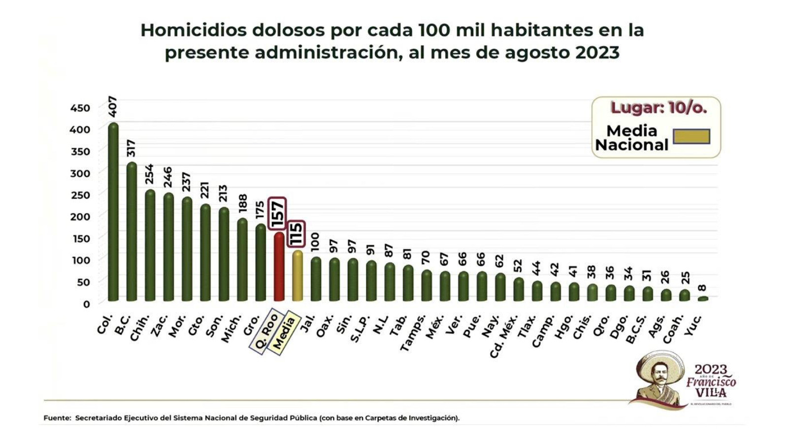 Xalapa, Ver., 17 de octubre de 2023.- El gobernador Cuitláhuac García Jiménez presentó las cifras de homicidio doloso del pasado mes de agosto, donde Veracruz ocupa el lugar 19 con 66 casos, muy por debajo de la media nacional que es de 115, por cada 100 mil habitantes. En el Informe de Incidencia Delictiva del Fuero Común hasta ese corte, pero en números absolutos, Veracruz registró 89 hechos que lo ubicaron en decimosegundo sitio, a diferencia de entidades como Guanajuato, Chihuahua y Jalisco, administradas por partidos de oposición a la Cuarta Transformación.
