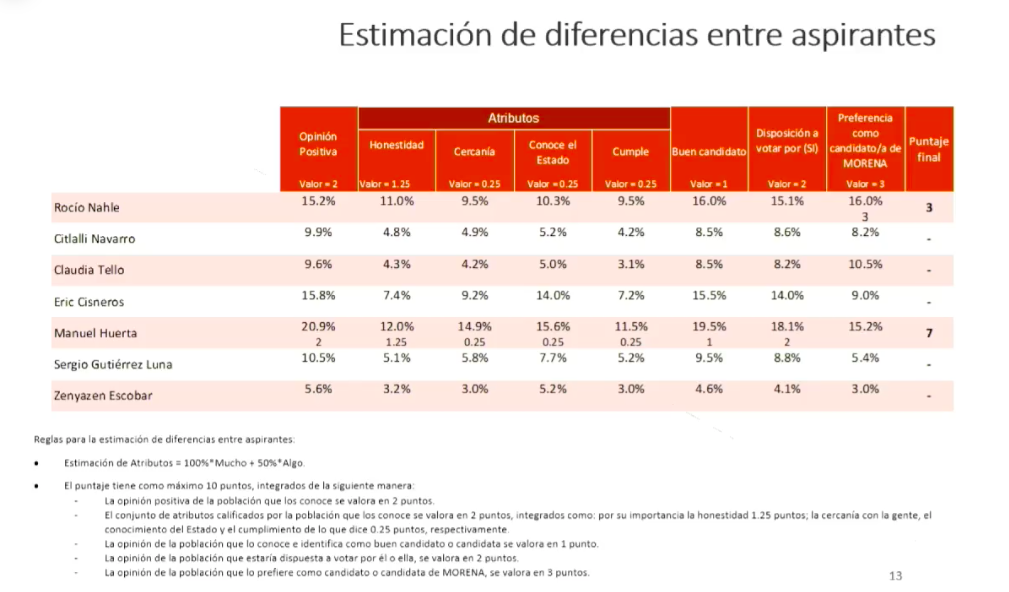 Los aspectos que se evaluaron fueron: Opinión positiva; Honestidad; Cercanía; Conoce el Estado; Cumple; Buen candidato; Disposición a votar; Preferencia como candidato/a de Morena; y posteriormente el Puntaje Final. Con la encuesta de María De las Heras, Rocío Nahle tiene un porcentaje final de 4.5 puntos y Manuel Huerta 8.5 puntos, por lo que De las Heras le da el mejor puntaje a Manuel Huerta. Mendoza y Blanco, en su encuesta espejo, ubica a Rocío Nahle con un porcentaje final de 6.5 puntos y Manuel Huerta de 3.5 puntos, por lo que Mendoza y Blanco le da el mejor puntaje a Rocío Nahle. En cuanto a los resultados internos de la Comisión de Encuestas, los presentó la diputada federal Ivonne Cisneros. En el Estudio de imagen y posicionamiento en el Estado de Veracruz, la encuesta interna en cuanto a la intención del voto por partido, el 55.7% votaría por Morena, y el 50.9% nunca votaría por el PRI. En la Evaluación de los Aspirantes, la encuesta interna les da un puntaje de 7 puntos a Manuel Huerta, mientras que Rocío Nahle se queda con 3 puntos, por lo que la encuesta interna le da el mejor puntaje a Manuel Huerta.