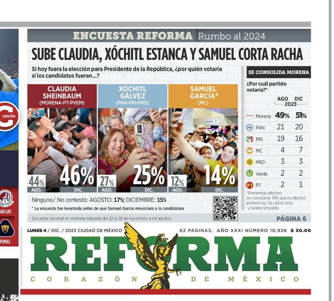 | De acuerdo a la última encuesta de El Reforma (uno de los periódicos nacionales más críticos del actual régimen), Xóchitl Gálvez ha perdido intención del voto |