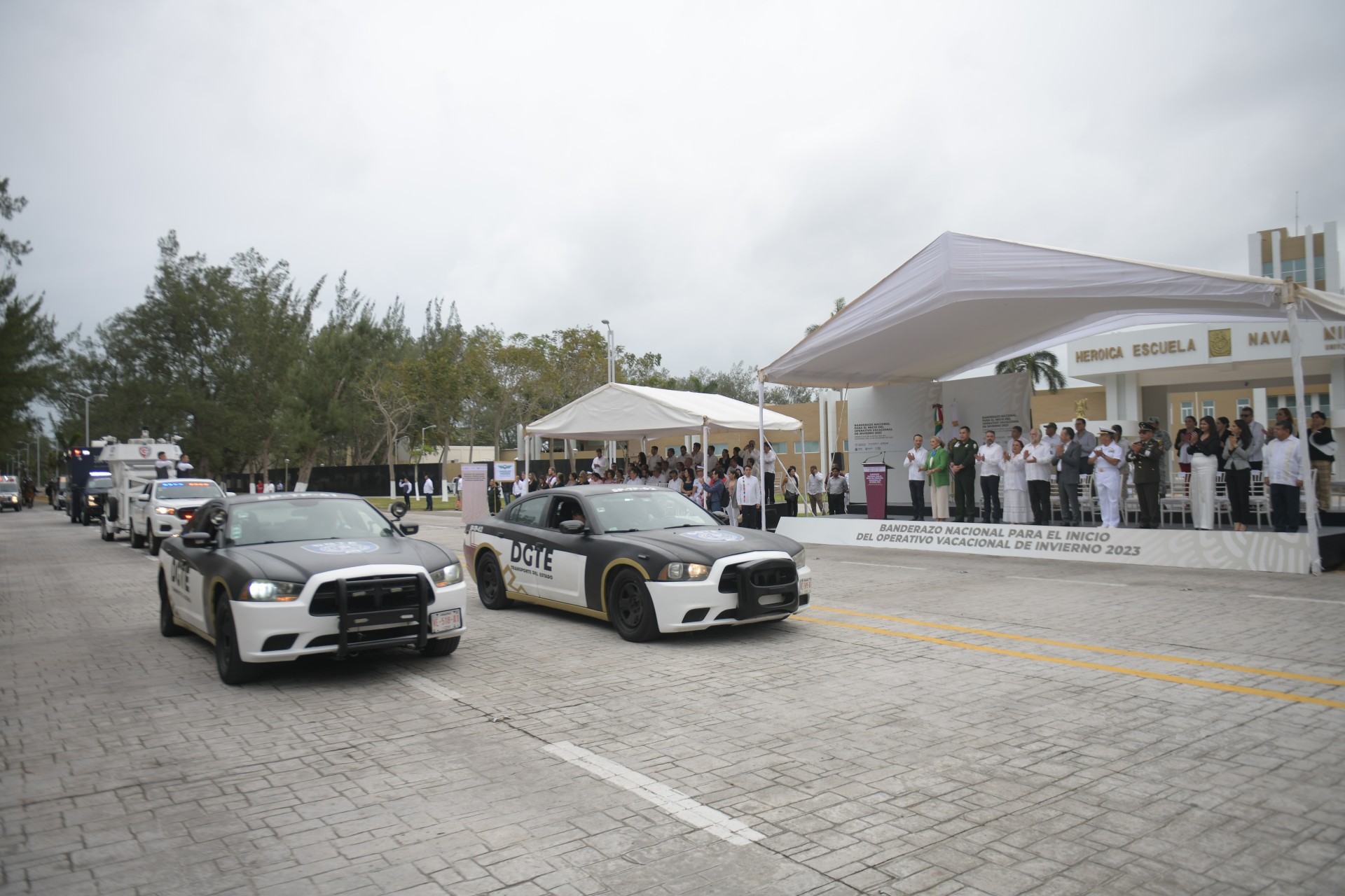 Xalapa, Ver., 13 de diciembre de 2023.- Al pasar de 5 a 26 millones de visitantes en cinco años, Veracruz ha recobrado la vocación turística nacional y pronto ofrecerá un renovado Aquarium, con una plaza comercial rehabilitada y más espectáculos de especies marinas, expresó el gobernador Cuitláhuac García Jiménez durante el banderazo del Operativo Vacacional Invierno 2023. Desde la Heroica Escuela Naval Militar de Antón Lizardo, en Alvarado, reconoció el decidido apoyo empresarial en esta transformación de la industria, mientras informó al titular de la Secretaría de Turismo (SECTUR) federal, Miguel Torruco Marqués, la recuperación de la Casa de Agustín Lara, en Boca del Río, tras 4 años de litigio. “Gracias por la confianza, no olviden que este rinconcito de mar y de palmeras borrachas de sol los espera con sus brazos extendidos de 700 kilómetros de playa para vacacionar”, dijo el mandatario, luego de recibir las llaves de 10 vehículos de la Dirección General de Servicios al Turista Ángeles Verdes, a los cuales el Gobierno estatal aportará nueve adicionales en 2024. A su vez, el encargado de la política turística nacional señaló que dichas radiopatrullas cubrirán 14 tramos carreteros que significan 2 mil 424 kilómetros, mientras la presencia de la corporación pasó de 41 a 74 municipios y la atención anual reportó un incremento del 323 por ciento y 494 en servicios desde el Centro de Geointeligencia Alfonso García González, el 078 y la aplicación móvil.