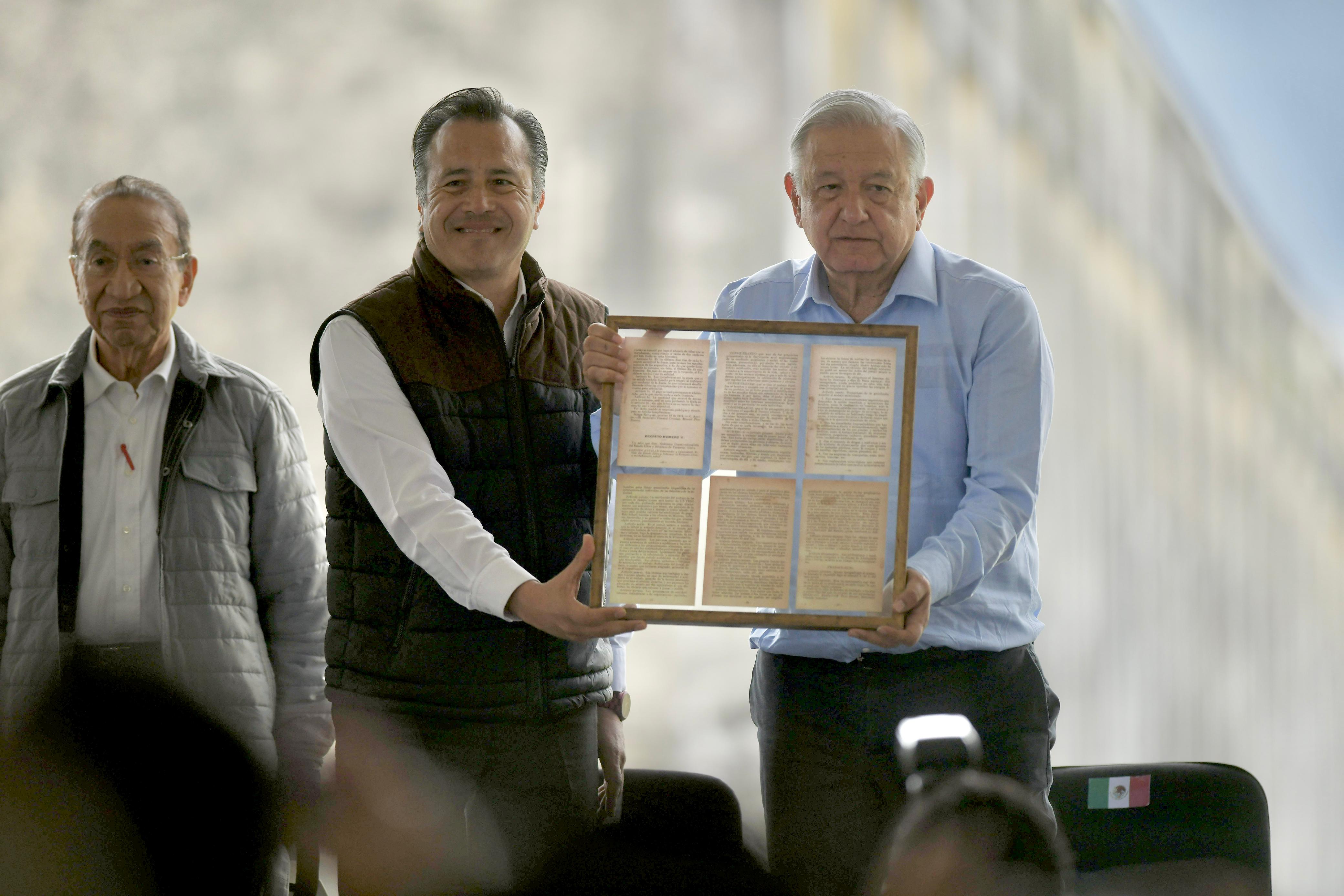 Río Blanco, Ver., 07 de enero de 2024.- Por sus contribuciones a una política laboral de equidad y justicia, el gobernador Cuitláhuac García Jiménez entregó al presidente Andrés Manuel López Obrador una réplica del Decreto del 19 de octubre de 1914 emitido por Cándido Aguilar Vargas en el que promulgó la primera Ley que fijó el salario mínimo para Veracruz. Al darle la bienvenida, en la ex-fábrica de textil, para conmemorar el 117 aniversario de los Mártires de Río Blanco, expresó que es un auténtico honor la presencia del mejor Presidente de México, que más ha hecho por los derechos y reivindicaciones de los trabajadores.