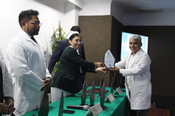 En el marco del 81º Aniversario del Instituto Mexicano del Seguro Social (IMSS), la Unidad Médica de Alta Especialidad (UMAE) Hospital de Especialidades No. 14, del Centro Médico Nacional (CMN) “Adolfo Ruíz Cortines”, realizó la ceremonia de conmemoración “Logros y casos de éxito 2023”. El director de la UMAE, doctor Víctor Bernal Dolores, presentó las estrategias del programa de trabajo y los proyectos para el ejercicio 2024, con la finalidad de brindar atención de tercer nivel de manera oportuna y de calidad a la población derechohabiente de las Representaciones del IMSS en Veracruz Norte y Sur, Tlaxcala, Oaxaca y Tabasco. Finalmente, las direcciones Médica, Administrativa, de Enfermería, así como Educación e Investigación presentaron los resultados relevantes obtenidos y casos de éxito, por lo que se entregaron reconocimientos al personal destacado. |