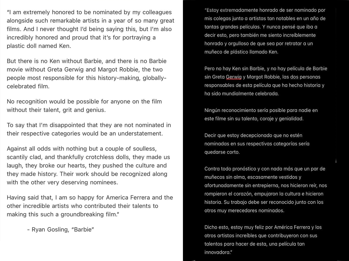Por su parte Ryan Gosling no se quedó callado y por medio de un comunicado expresó sus sentimientos pues aunque está muy agradecido de haber sido considerado, también se dijo decepcionado pues para él fue un desaire que sus compañeras no fueran tomadas en cuenta: "no hay Ken sin Barbie, y no hay película de Barbie sin Greta Gerwig y Margot Robbie, las dos personas responsables de esta película histórica y mundialmente celebrada. Decir que estoy decepcionado de que no estén nominadas sería quedarse corto". Además enfatizó que sin el trabajo de ambas, ni él ni el elenco habrían logrado todo lo que lograron en taquilla "contra todo pronóstico, con nada más que un par de muñecos sin alma, con poca ropa y afortunadamente sin entrepierna, nos hicieron reír, nos rompieron el corazón, impulsaron la cultura e hicieron historia. Su trabajo debe ser reconocido junto con el de otros nominados muy merecedores". Finalmente, Ryan aprovechó para felicitar a su compañera América Ferrara, quién también fue nominada como actriz de soporte.