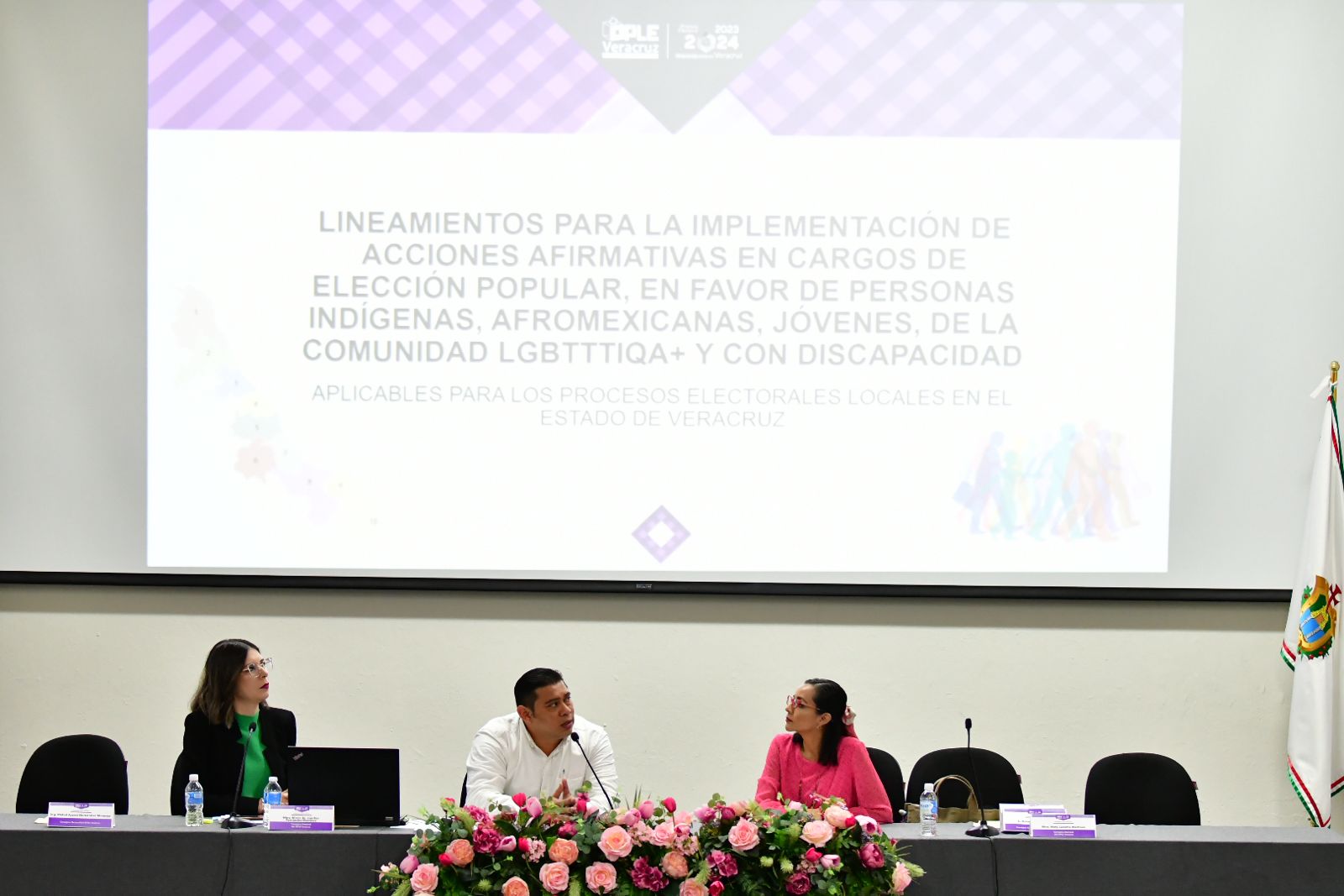 Xalapa, Veracruz, 22 de febrero de 2024. Con la finalidad de concientizar, promover, dotar de herramientas y conocimientos a las representaciones partidistas en el Proceso Electoral Local Ordinario 2023-2024, el Organismo Público Local Electoral del Estado de Veracruz (OPLE Veracruz) realizó la capacitación en materia de Lineamientos para la Implementación de Acciones Afirmativas en Cargos de Elección Popular, en favor de Personas Indígenas, Afromexicanas, Jóvenes, de la Comunidad LGBTTTIQA+ y con Discapacidad. Cabe destacar que, la Consejera Presidenta del OPLE Veracruz, Marisol Alicia Delgadillo Morales explicó que la capacitación tiene como objetivo abonar sobre lo que será la incorporación de estos lineamientos en el actual Proceso Electoral, pues se han implementado cuotas que los partidos políticos tienen que cumplir mediante sus postulaciones y registro de candidaturas. "Recalcar que estos lineamientos buscan consolidar esta igualdad sustantiva, garantizar el principio de paridad, establecer las reglas para la implementación de las acciones afirmativas para personas en situación de vulnerabilidad y que esto sea reflejado en el registro de las candidaturas de los próximos comicios", puntualizó. De igual forma, el Consejero Electoral, Roberto López Pérez mencionó que el poder dar voz a las personas que no la han tenido, dota de una igualdad paritaria a la democracia, por lo que reconoció el esfuerzo del OPLE Veracruz y de los partidos políticos para favorecer a los grupos históricamente discriminados.