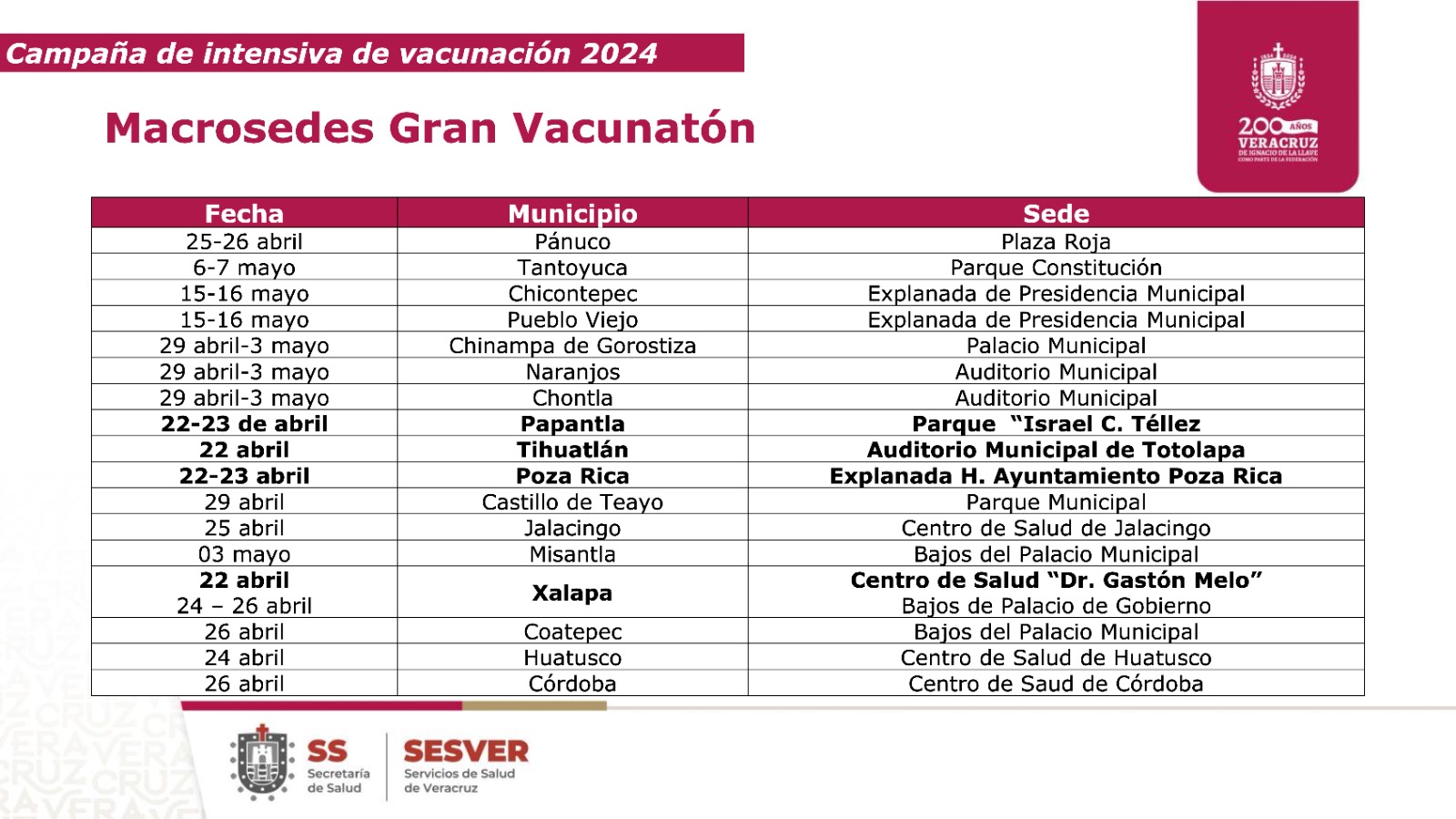 Xalapa, Ver., 22 de abril de 2024.- Como parte de las acciones preventivas del Gobierno del Estado, la Secretaría de Salud (SS) convoca a la población a participar en la campaña intensiva Gran Vacunatón durante este mes y hasta el 31 de mayo en todas las unidades médicas de los 212 municipios del estado. En las sedes serán aplicados los biológicos contemplados dentro del Programa de Vacunación Universal, con énfasis en las Triple Viral y Hexavalente, en los grupos de mayor vulnerabilidad para poliomielitis, sarampión y rubéola, principalmente dirigidos a menores de 10 años. Al respecto, las autoridades enfatizaron la importancia de la colaboración ciudadana ante el Aviso Epidemiológico por sarampión emitido el pasado 09 de abril que notificó la existencia de 4 casos en México y 105 en la región de las Américas. Entre los síntomas de dicho padecimiento destacan fiebre, exantema, ronchas y meningitis. Se recomienda a los asistentes acudir a la unidad más cercana con su cartilla o, de no poseerla, adquirir una en las instalaciones. Asimismo, a mantenerse informados mediante las redes sociales oficiales de la SS o a través del número 800 0123456, donde pueden consultar las próximas sedes, las vacunas indicadas de acuerdo a cada edad y dudas en general. Cabe mencionar que el esquema de vacunación mexicano es uno de los más completos del mundo conformado por 14 opciones gratuitas para más de 16 enfermedades como: influenza AH1N1, Hepatitis B, cáncer cervicouterino, tuberculosis, neumonía, difteria, poliomielitis y muchas más.