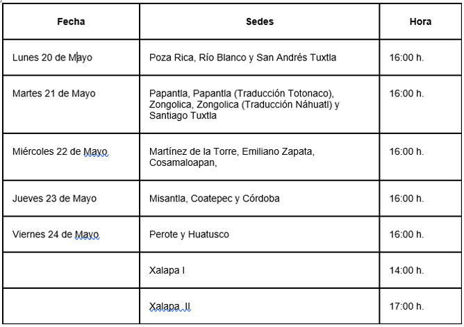 Se desarrollan con base a lo que estípula la Convocatoria dirigida a las personas candidatas con registro que contienden a las Diputaciones Locales por el Principio de Mayoría Relativa del Estado de Veracruz Xalapa, Veracruz, 16 de mayo de 2024. Los debates entre personas candidatas con registro que contienden a las Diputaciones Locales por el Principio de Mayoría Relativa, que organiza el Organismo Público Local Electoral del Estado de Veracruz (OPLE Veracruz) como parte del Proceso Electoral Local Ordinario 2023-2024, se desarrollan en tiempo y forma como se tienen proyectados. La Comisión Temporal de Debates, presidida por el Consejero Electoral, Roberto López Pérez, es la encargada de organizar, difundir y realizar estos ejercicios democráticos en toda la entidad en coordinación con los 30 Comités de Debates instalados en los Consejos Distritales del OPLE Veracruz, con el objetivo de que la ciudadanía pueda emitir un voto informado y razonado el próximo domingo 2 de junio. El día martes 14 de mayo iniciaron estos ejercicios para las Diputaciones Locales por el principio de Mayoría Relativa con una gran concurrencia y orden por parte de las candidaturas, en los distritos: 14 de Veracruz I, 29 de Coatzacoalcos I, 15 de Veracruz II, 30 de Coatzacoalcos II y 01 de Pánuco. Para el miércoles 15 de mayo se realizaron los debates de los distritos: 16 de Boca del Río, 28 de Minatitlán y 02 de Tantoyuca; el jueves 16 de mayo en los distritos: 17 de Alvarado, 03 de Tuxpan y 26 de Cosoleacaque. Cabe destacar que, el OPLE Veracruz cumple con la organización de todos los debates, sin embargo en los distritos de 01 de Pánuco, 02 de Tantoyuca, 03 Tuxpan y 26 de Cosoleacaque, no se llevaron a cabo, ya que los candidatos no se presentaron para este ejercicio democrático, siendo necesario un mínimo de dos candidaturas, como lo marca al artículo 15 numeral 3 y 16 numeral 2 del Reglamento de Debates entre Candidatas y Candidatos a Cargos de Elección Popular del Organismo Público Local. Para el viernes 17 de mayo, se proyecta realizar esta misma actividad en los distritos de: 04 de Álamo, 20 de Orizaba y 27 de Acayucan. La siguiente semana, los debates iniciarán el lunes 20 de mayo en los distritos: 05 de Poza Rica, 21 de Río Blanco y 25 de San Andrés Tuxtla; martes 21 de mayo, las actividades se concentrarán en los distritos: 06 de Papantla, 22 de Zongolica y 24 de Santiago Tuxtla. En cuanto, al miércoles 22 de mayo, los debates a las Diputaciones Locales serán en los distritos: 07 Martínez de la Torre, 13 de Emiliano Zapata y 23 de Cosamaloapan; con respecto al jueves 23 de mayo, se realizarán en los distritos: 08 de Misantla, 12 de Coatepec y 19 de Córdoba. El último día, viernes 24 de mayo, las actividades concluirán en los distritos: 09 de Perote, 10 de Xalapa I, 11 de Xalapa II y 18 de Huatusco. Todos los debates entre personas candidatas con registro que contiendan a las Diputaciones Locales por el Principio de Mayoría Relativa contarán con una interpretación en Lengua de Señas Mexicana; así como, se realizarán traducciones simultáneas a lenguas originaria: Huasteco en Tantoyuca, Totonaco en Papantla y Náhuatl en Zongolica.