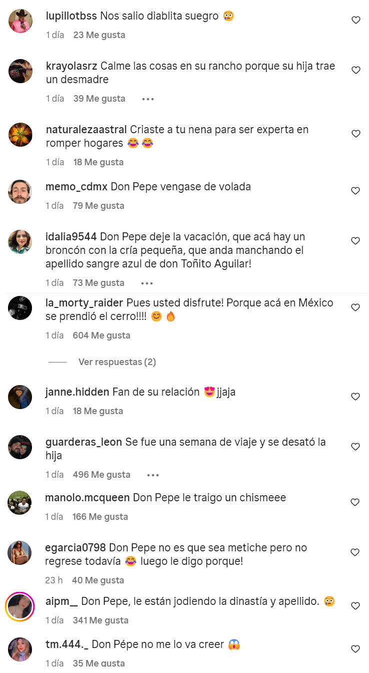 El cantante compartió un video en el que celebra 27 años juntos con Aneliz el cual rápidamente se llenó de comentarios, pero no de los que seguramente esperaban, sino de la controversial relación de su hija con el cantante sonorense. Pepe Aguilar terminó limitando los comentarios de sus publicaciones porque se empezaron a llenar de comentarios burlescos acerca de lo que estaba sucediendo en México y aunque algunos eran de usuarios indignados, la mayoría son humorísticos, convirtiendo las palabras "Don Pepe" en el inicio de las divertidas frases.
