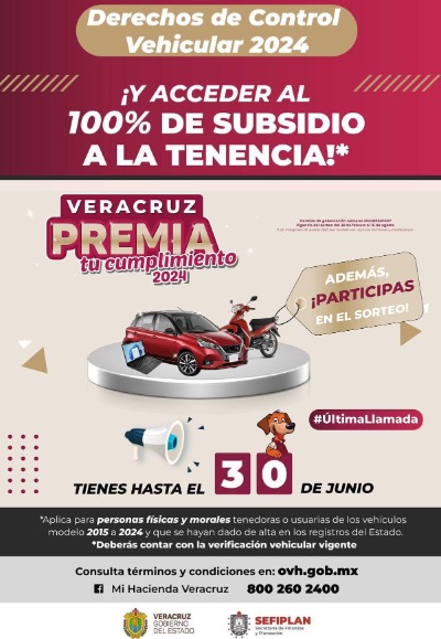 Al inicio de la presente administración, el gobernador Cuitláhuac García Jiménez emitió un decreto que está vigente desde el 2018 hasta este 2024, para que aquellas personas que paguen sus derechos vehiculares antes del 30 de abril, se les condone la Tenencia. Es probable que Usted sea un contribuyente cumplidor y por eso dé por descontada la Tenencia, sin embargo este impuesto está vigente en Veracruz, solo que al día de hoy, cuenta con la salvedad de que se puede evitar, lo que por sí mismo ya debería ser un aliciente suficiente para que los dueños de vehículos paguen en tiempo sus derechos de Control Vehicular. No obstante, por si ese aliciente fuera insuficiente, el Gobierno del Estado a través de la Secretaría de Finanzas a cargo de José Luis Lima Franco, atinadamente ha extendido el plazo del pago de dichos derechos vehiculares hasta el día último de junio… y si eso no fuera suficiente (¡Caray! ¿Qué más quieren?), ahora por segundo año consecutivo, se lleva a cabo el Sorteo del Programa “Veracruz premia tu cumplimiento”, el cual es un reconocimiento a todos los contribuyentes que cumplen en tiempo y forma pagando sus derechos de Control Vehicular. Dicho sorteo se llevará a cabo el 16 de agosto y participar en él, es muy fácil, según explicó Diego David Meléndez Bravo, Subsecretario de Ingresos de la Sefiplan, a quien esto escribe. Se deben cumplir cuatro requisitos: - Haber pagado sus derechos vehiculares antes del 30 de junio; - Ser persona física (no entran las personas morales); - Contar con placas vigentes (las de la administración pasada o las placas de esta administración); - Verificación vehicular al corriente. Teniendo estos cuatro requisitos puede Usted participar en la rifa de 5 vehículos nuevos, 10 motocicletas y 50 laptops. Estos premios se dividirán equitativamente en las 5 regiones del Estado, por lo que a cada región le tocará 1 vehículo, 2 motocicletas y 10 laptops. La cosa está tan fácil que ni siquiera es necesario registrarse para descargar el boleto, cada vehículo registrado que cumpla con los requisitos antes descritos, tendrá asignado un número de folio para la rifa. ¡Sensacional! ¿No?