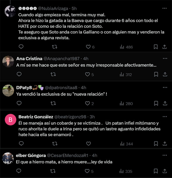 Las declaraciones de Irina han causado revuelo en redes sociales donde se le han ido con todo al actor, lo tachan de patán y emocionalmente inestable y se ha convertido en foco de fuertes críticas.