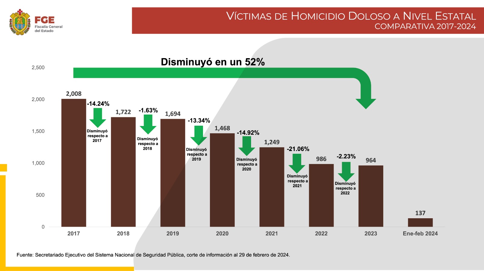 Boca del Río, Ver., 14 de agosto de 2024.- En Veracruz no hay delito sin castigo, ni impunidad para nadie; la búsqueda de bienestar y el quehacer policial disminuyeron los homicidios, secuestros y feminicidios, mientras que las detenciones de responsables y sentencias aumentaron, manifestó el gobernador Cuitláhuac García Jiménez. En lo que va del sexenio, el número de homicidios dolosos redujo en un 52 por ciento, las detenciones incrementaron un 53% y las sentencias un 439%. En cuanto al secuestro, decreció un 91% y un 110% recibió condenas. Por su parte, el feminicidio bajó 55.45% y las sanciones se elevaron en 457%. Durante su participación en la Primera Asamblea Plenaria Ordinaria de la Conferencia Nacional de Seguridad Pública Municipal, el mandatario reiteró su compromiso de seguir apoyando la Estrategia Nacional de Paz y Seguridad hasta el último día de su gestión.
