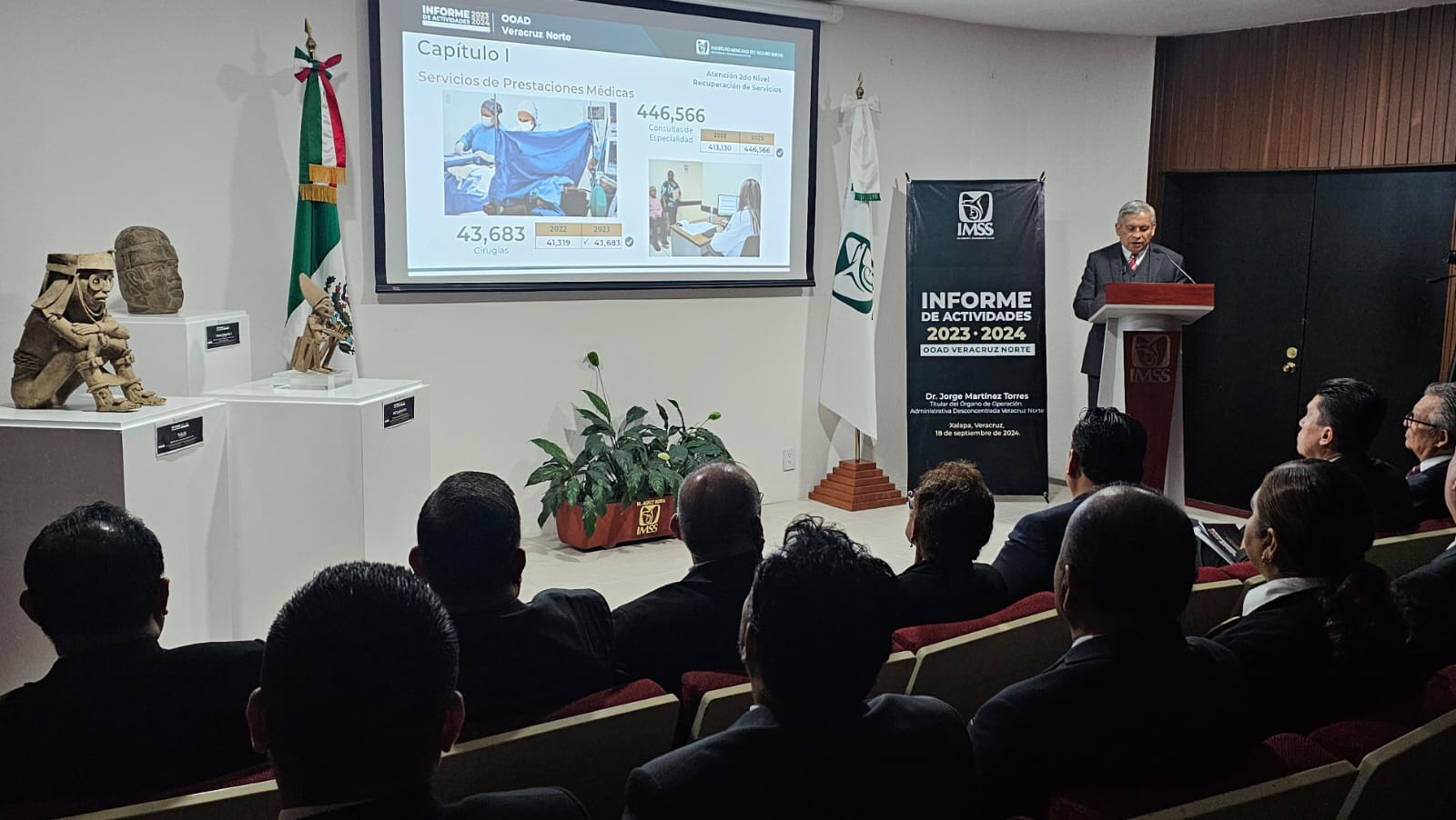 El titular de la Representación Regional del Instituto Mexicano del Seguro Social (IMSS) en Veracruz Norte, doctor Jorge Martínez Torres rindió su informe de las acciones realizadas durante el ejercicio 2023 y presentó el programa de trabajo 2024 durante la XVIII Sesión Ordinaria ante el Honorable Consejo Consultivo Delegacional. En este sentido, el doctor Martínez Torres destacó que en las Unidades de Medicina Familiar se realizaron dos millones 671 mil 920 consultas y 225 mil 588 detecciones de sobrepeso, obesidad, diabetes mellitus, hipertensión arterial, de igual manera, se realizaron 850 mil 502 chequeos PrevenIMSS intra y extramuros, así como 185 Ferias de la Salud, con lo cual se benefició a 122 mil 865 derechohabientes. Para la detección oportuna de cáncer de mama, se efectuaron 35 mil 237 mastografías en mujeres de 40 a 69 años. Se llevaron a cabo un total de 46 jornadas, de las que, 24 fueron de Continuidad de Servicios y 22 bajo el nombre “Con el Águila Bien Puesta”, en las cuales se otorgaron 163 mil 348 consultas de especialidad y 11 mil 401 cirugías. Se celebraron Acuerdos de Gestión con la Unidad Médica de Alta Especialidad Hospital de Especialidad No. 14 C.M.N. “Adolfo Ruíz Cortines” y se firmaron por primera vez Acuerdos de Gestión con el Órgano de Operación Administrativa Desconcentrada del IMSS Tamaulipas. Gracias a las acciones de seguimiento de la Jefatura de Finanzas con las Unidades Responsables del Gasto, se obtuvo el 3er lugar a nivel nacional.