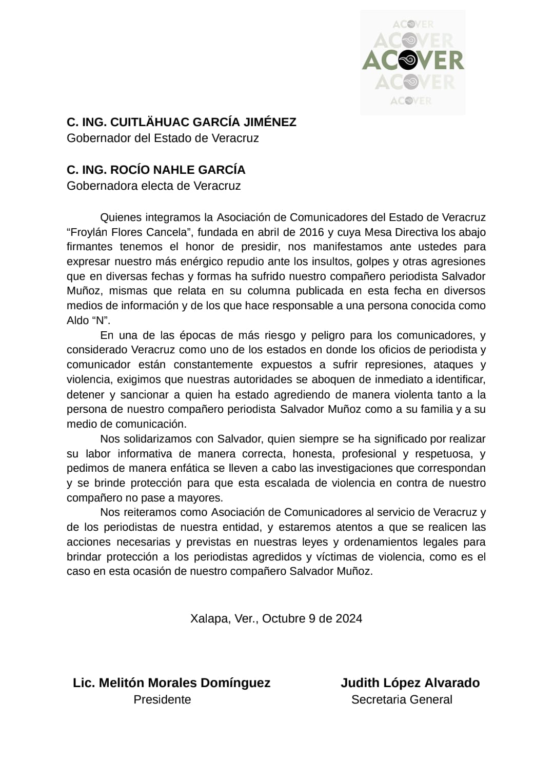 | ACOVER se solidariza y condena agresiones contra el periodista Salvador Muñoz |