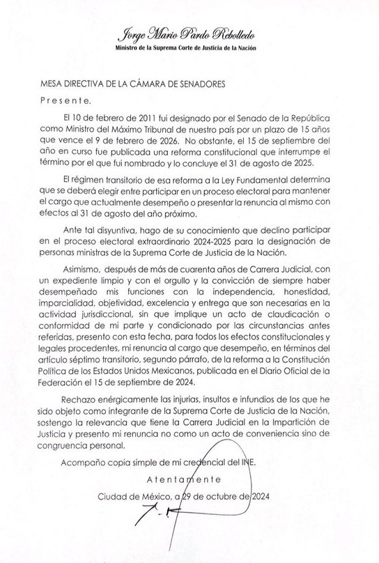 | (Documento) Cero y van dos. Renuncia Pardo Rebolledo a la Suprema Corte de Justicia |