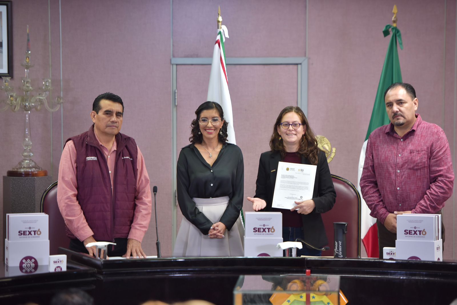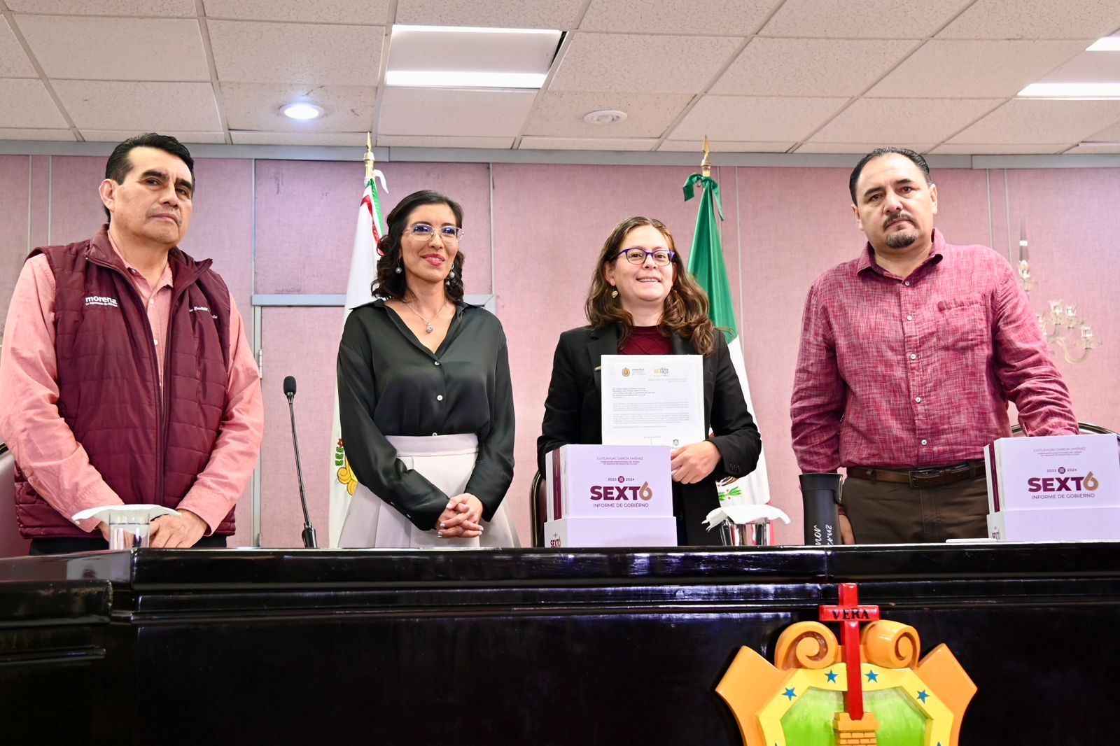 Xalapa, Ver., 15 de noviembre de 2024.- La LXVII Legislatura, por conducto de la presidenta y del secretario de la Mesa Directiva, diputada Tanya Carola Viveros Cházaro y Felipe Pineda Barradas, respectivamente, así como por el presidente de la Junta de Coordinación Política (Jucopo), diputado Esteban Bautista Hernández, recibió de la titular de la Oficina de Programa de Gobierno, Waltraud Martínez Olvera, el VI Informe de Gobierno de la administración del ingeniero Cuitláhuac García Jiménez. Con lo anterior, se da cumplimiento a lo dispuesto en la fracción XXI del Artículo 49 de la Constitución Política del Estado de Veracruz de Ignacio de la Llave, en materia de rendición de cuentas.