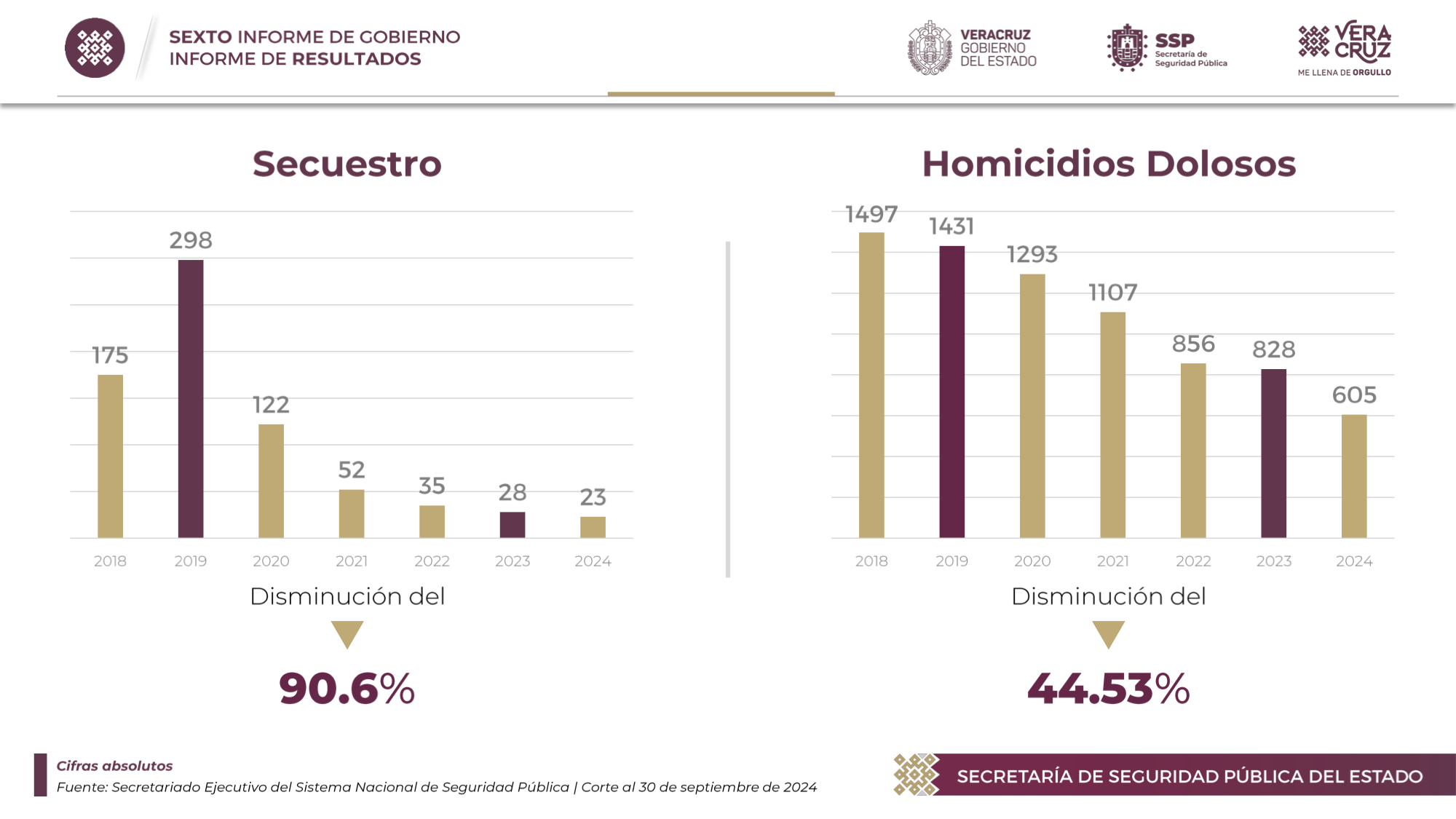 Xalapa, Ver., 20 de noviembre de 2024.- Mediante el esfuerzo cotidiano, la excelente coordinación entre instancias de los diferentes órdenes y el liderazgo del gobernador Cuitláhuac García Jiménez construimos la paz en Veracruz con justicia y dignidad; las políticas de la Secretaría de Seguridad Pública priorizan el bienestar de la población al atacar las causas que originan la violencia. Así lo expresó el titular de la dependencia, Cuauhtémoc Zúñiga Bonilla, en la Glosa del VI Informe de Gobierno, convencido de que la puesta en marcha de medidas preventivas, la aplicación eficaz de tecnología, trabajo de inteligencia y particularmente la profesionalización y dignificación policial permitieron ubicar a Veracruz como la octava entidad más segura del país. En este sentido, destacó la reducción histórica en los delitos de mayor impacto a la sociedad: secuestro en 90.6 por ciento, homicidios dolosos 44.53, feminicidios 54.47 y robo de vehículos 47.22; en gran parte, gracias al fortalecimiento y rediseño de la estrategia operativa y de inteligencia, el incremento del estado de fuerza en un 148%, a la par de armamento, equipamiento y capacitación.
