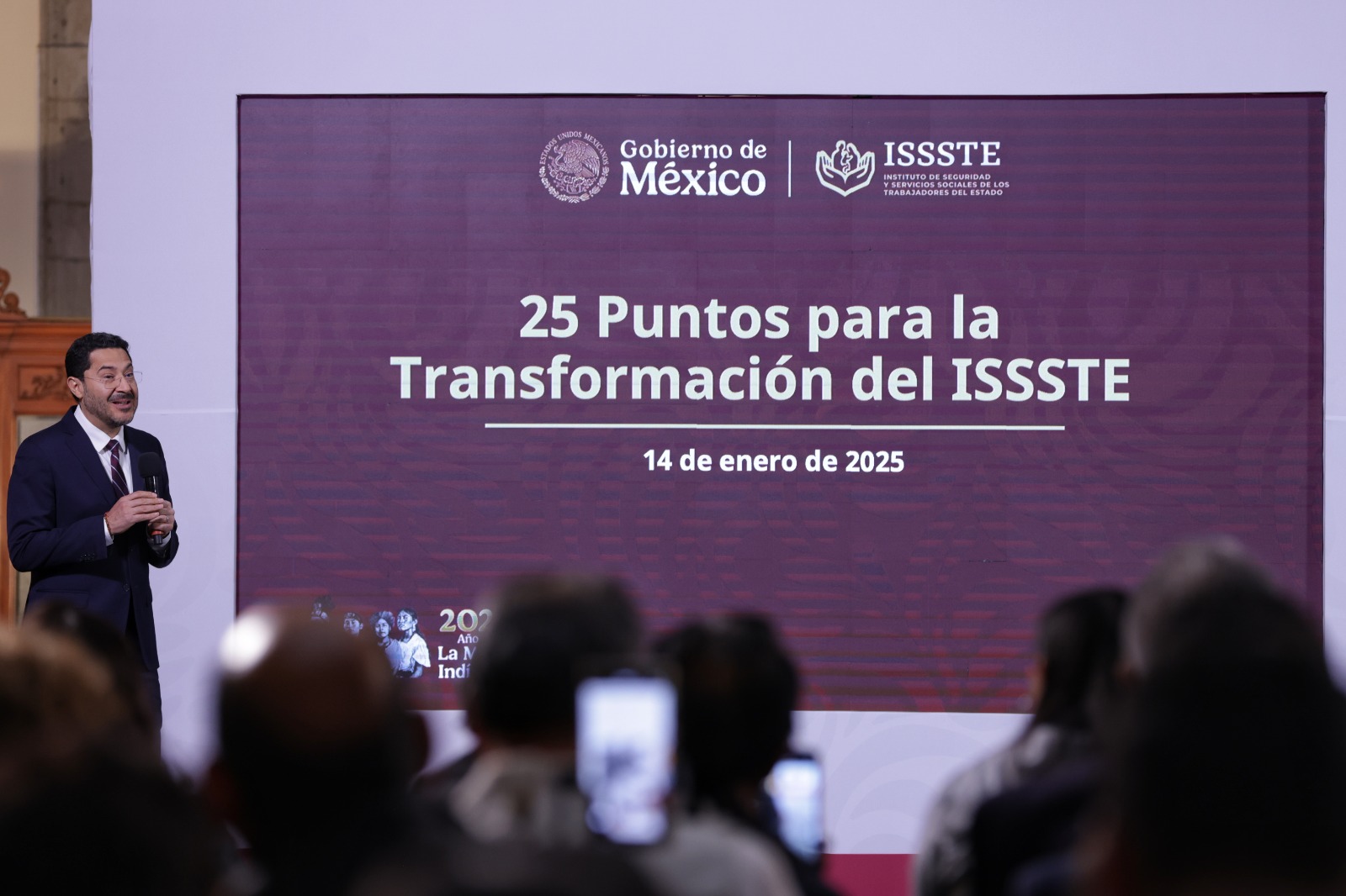 Destaca la homologación gradual de salarios de personal médico y enfermería con los del IMSS; implementación del Programa “La Clínica es Nuestra”; liquidaciones y condonaciones a 400 mil acreditados; ajuste o cancelación de pensiones que de manera irregular exceden el límite máximo legal; y reformas a la Ley del ISSSTE para que FOVISSSTE adquiera, mejore y construya vivienda para ser vendida o arrendada a bajo costo, y para que las cuotas de servidores públicos con mayores ingresos, así como de entidades y dependencias se calculen sobre salario integrado Ciudad de México, a 14 de enero de 2025.- El director general del Instituto de Seguridad y Servicios Sociales de los Trabajadores del Estado (ISSSTE), Martí Batres Guadarrama, presentó en la conferencia matutina: "La mañanera del pueblo" de la Presidenta Claudia Sheinbaum Pardo, el Plan para la Transformación del ISSSTE basado en 25 puntos, el cual tiene como propósito fortalecer los derechos de las y los trabajadores. "Hemos venido trabajando una serie de lineamientos que nos ha dado la Presidenta y los expresamos en estos 25 puntos para la transformación del ISSSTE; esto es en el marco del Segundo Piso de la Cuarta Transformación, para que el ISSSTE tenga una nueva etapa de mejoras sustantivas. El objetivo es fortalecer los siguientes cuatro ejes y derechos: salud, vivienda, seguridad social integral y combate a la corrupción y fortalecimiento financiero", destacó. Como parte del eje de salud, enlistó en primer lugar el trabajo para poner en el centro a la derechohabiencia, a través de la cercanía y buen trato en la atención; segundo, homologar los salarios del personal médico y de enfermería del ISSSTE con los del Instituto Mexicano del Seguro Social (IMSS), de forma gradual; tercero, aumentar la plantilla de personal médico, de enfermería y de especialidades; y cuarto, implementar con IMSS Bienestar y participación social el Programa “La Clínica es Nuestra” para mantenimiento y equipamiento de unidades médicas de primer nivel del Instituto. En quinto lugar, dijo Martí Batres, se llevarán a cabo obras de mantenimiento mayor en algunas unidades que lo requieren; y sexto, ampliar la nacionalización de hospitales, atenciones y servicios médicos. "Se han nacionalizado varios hospitales, falta el de Tláhuac, y hay servicios integrales médicos que se nacionalizaron como el de imagenología, el de hemodinamia, el de anestesia, pero están pendientes otros como osteosíntesis, laboratorios, banco de sangre y otros más", comentó.