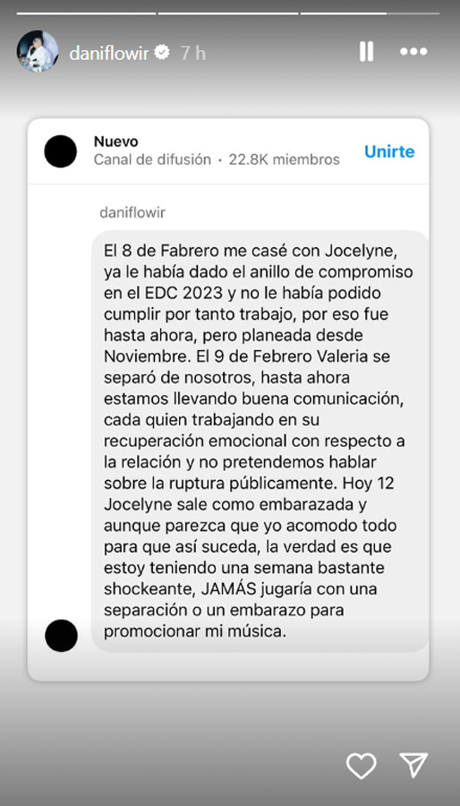Este miércoles, el también compositor anunció por medio de sus redes sociales que la relación que mantenían él y su ahora esposa Jocelyn con Valeria "Valecita Flow" Zepeda, dejando claro que aunque habrían terminado en buenos términos, no hablarán públicamente de la ruptura. "El 8 de febrero me casé con Jocelyne, ya le había dado el anillo de compromiso en el EDC 2023 y no le había podido cumplir por tanto trabajo, por eso fue hasta ahora, pero planeada desde Noviembre. El 9 de Febrero Valeria se separó de nosotros, hasta ahora estamos llevando buena comunicación, cada quien trabajando en su recuperación emocional con respecto a la relación y no pretendemos hablar sobre la ruptura públicamente."