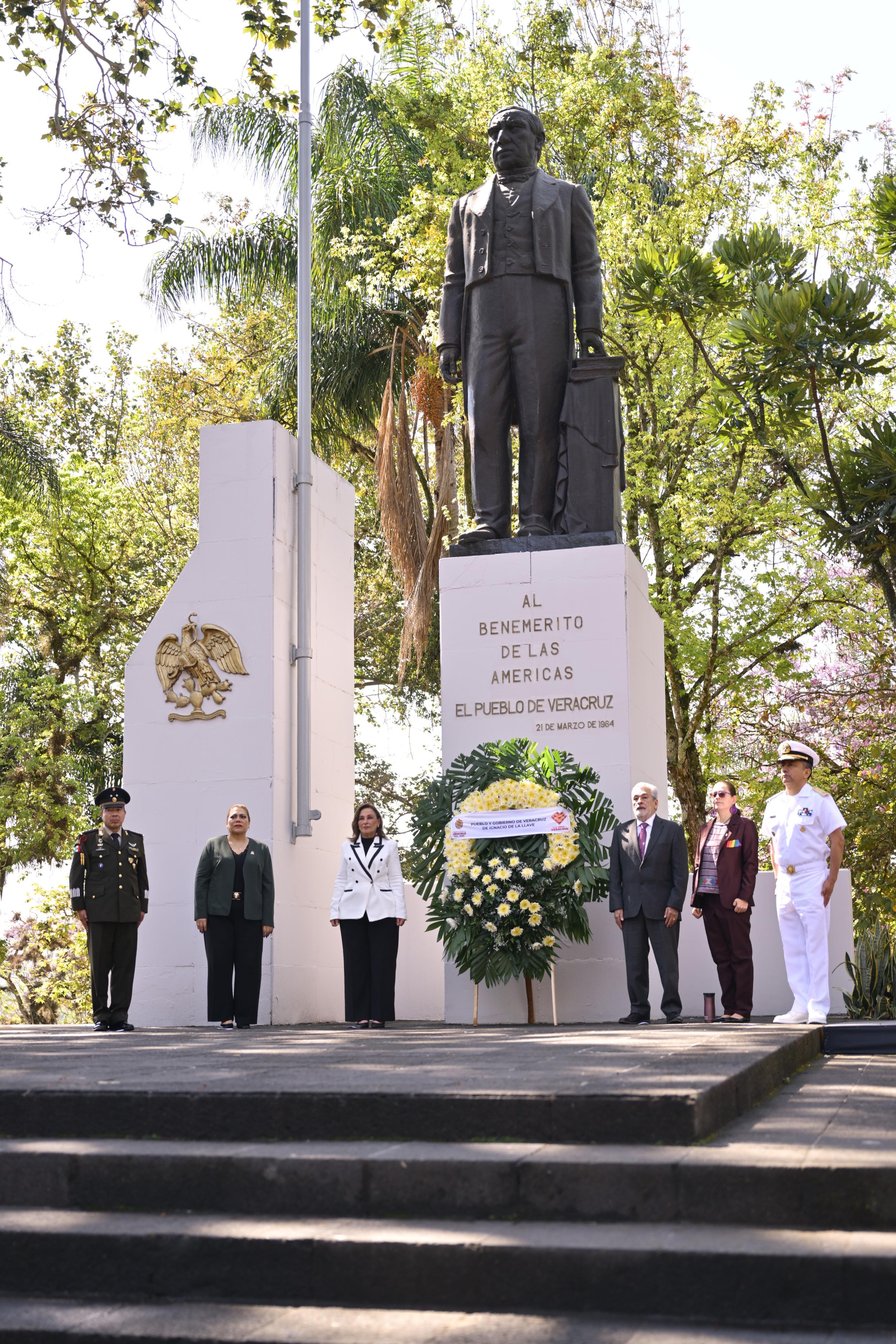 Xalapa, Ver., 21 de marzo de 2025.- La presidenta de la Mesa Directiva de la LXVII Legislatura, diputada Tanya Carola Viveros Cházaro, asistió a la ceremonia conmemorativa, guardia de honor y ofrenda floral con motivo del CCXIX aniversario del natalicio del Benemérito de las Américas, Benito Juárez, en el que estuvo al lado de la gobernadora de Veracruz, Rocío Nahle García; de la presidenta del Poder Judicial del estado, magistrada Lisbeth Aurelia Jiménez Aguirre, así como autoridades militares, navales, del gabinete estatal y municipales.