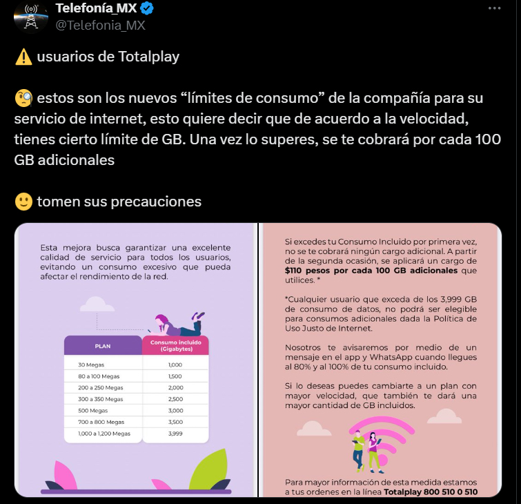 Durante los últimos días, la noticia de que el proveedor de internet Total Play modificará sus planes con la supuesta finalidad de mejorar el servicio que proporciona, evitando problemas de conectividad, con la modalidad del "Internet simétrico". Por medio de un correo electrónico, el proveedor de internet informó a sus usuarios que a partir de el próximo 15 de abril de 2025, aplicaría esta modalidad en todos sus planes, lo que significa que los usuarios dispondrán de la misma velocidad de carga y descarga, sin embargo, este "beneficio" viene acompañado de un límite de consumo, que en caso de ser excedido, implicará costos adicionales.