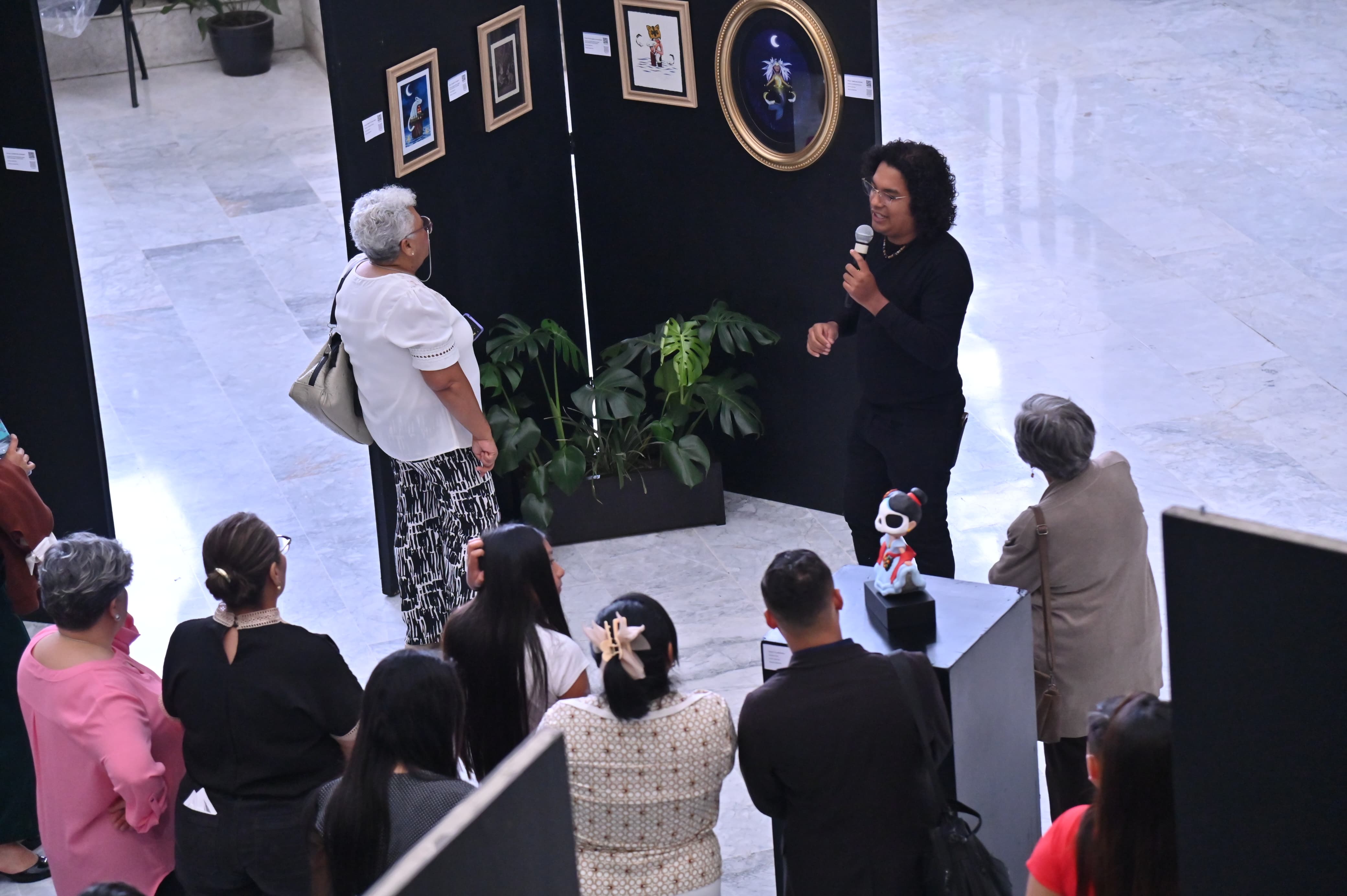 Xalapa, Ver., 23 de abril de 2025.- El Palacio Legislativo de Veracruz es un espacio propicio para todas las expresiones artísticas. Este día, en la explanada anterior al Recinto Oficial de Sesiones, el artista veracruzano Jesús Saí presentó su exposición Ecos de la Infancia, compuesta por obra gráfica y esculturas que remiten a los juegos tradicionales, la inocencia y los sueños. Las canicas, el trompo, imágenes religiosas, gastronomía regional, costumbres, otros elementos de índole social y recuerdos de la niñez son lo que el espectador puede encontrar en esta muestra. A través del arte, Jesús Saí busca concientizar a los padres sobre la importancia de fomentar el conocimiento de las formas tradicionales de interactuar y de vivir la niñez.