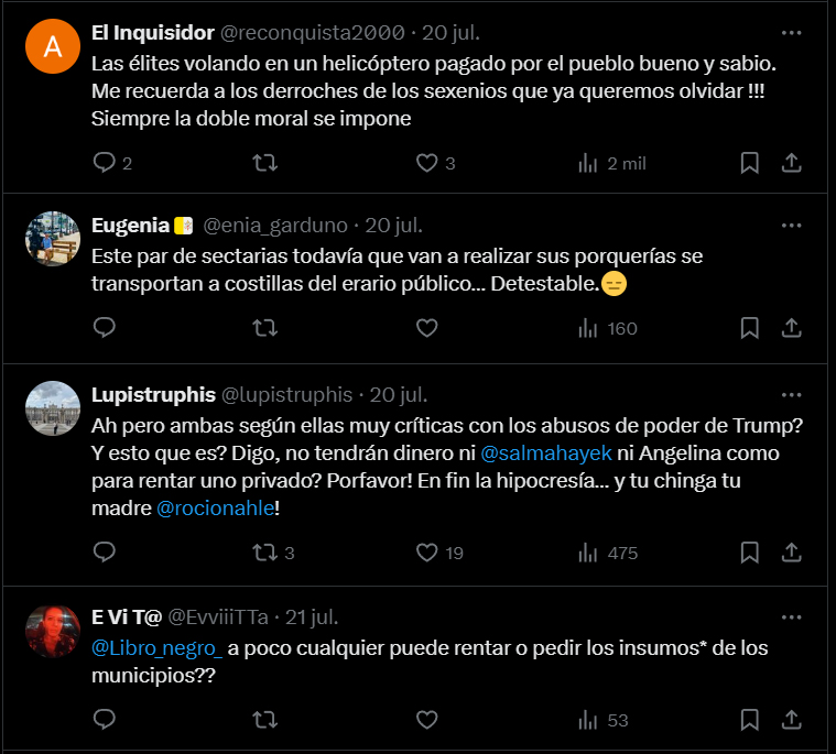 Las reacciones en redes sociales han sido intensas. Muchos cuestionan por qué el gobierno de Veracruz utilizaría un helicóptero estatal para el traslado de celebridades, especialmente cuando aún no hay claridad sobre los motivos de su visita ni la fuente de financiamiento para dicho viaje. Las dudas se profundizan al considerar que el helicóptero podría estar destinado para emergencias y otras funciones gubernamentales, lo que incrementa las sospechas sobre un posible desvío de recursos. El gobierno estatal, encabezado por la gobernadora Rocío Nahle, aún no ha emitido una postura oficial sobre el uso de la aeronave. Nahle fue interrogada el 16 de julio por la prensa en Veracruz, pero evitó entrar en detalles sobre la visita de las actrices. "Nada más vine a saludarlas", dijo en esa ocasión, y agregó con tono ligero: "Veracruz está de moda". Sin embargo, no aclaró si su encuentro con las actrices estaba vinculado a algún proyecto cinematográfico. A pesar de las versiones no confirmadas de que Hayek y Jolie estarían explorando locaciones en Veracruz para un proyecto cinematográfico, hasta el momento no ha habido confirmación oficial sobre el propósito de su presencia en el estado. Esta falta de transparencia ha aumentado las dudas, ya que la ausencia de una justificación clara sobre el uso de un helicóptero gubernamental alimenta las sospechas de que podría haberse utilizado para fines personales o turísticos. La controversia no es menor, pues varios actores políticos locales han solicitado que se aclare el origen de los recursos utilizados para el traslado. Activistas y analistas señalan que, de confirmarse el uso indebido de un helicóptero oficial sin una justificación adecuada, podría tratarse de un acto de desvío de recursos públicos, lo cual estaría en contra de los principios de austeridad y transparencia promovidos por el gobierno federal y estatal.