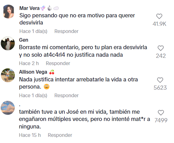 Reacciones y consecuencias legales El testimonio de Marianne Gonzaga ha dividido la opinión pública. Mientras algunos usuarios en redes sociales muestran empatía hacia su situación, entendiendo que la traición de su exnovio y la modelo la llevaron a una reacción violenta, otros la condenan por sus actos. La influencer, por su parte, aseguró que las acciones que tomaron ese día no fueron premeditadas, pero afirmó que el dolor por la traición la desbordó. Entre los comentarios a favor, destacan frases como: "No se justifica lo que hizo Marianne, pero claramente Valentina y José la llevaron a la locura total" y "Ahora entiendo por qué reaccionó así, aunque no era la manera". Sin embargo, algunos también la critican, argumentando que no hay justificación para la violencia.