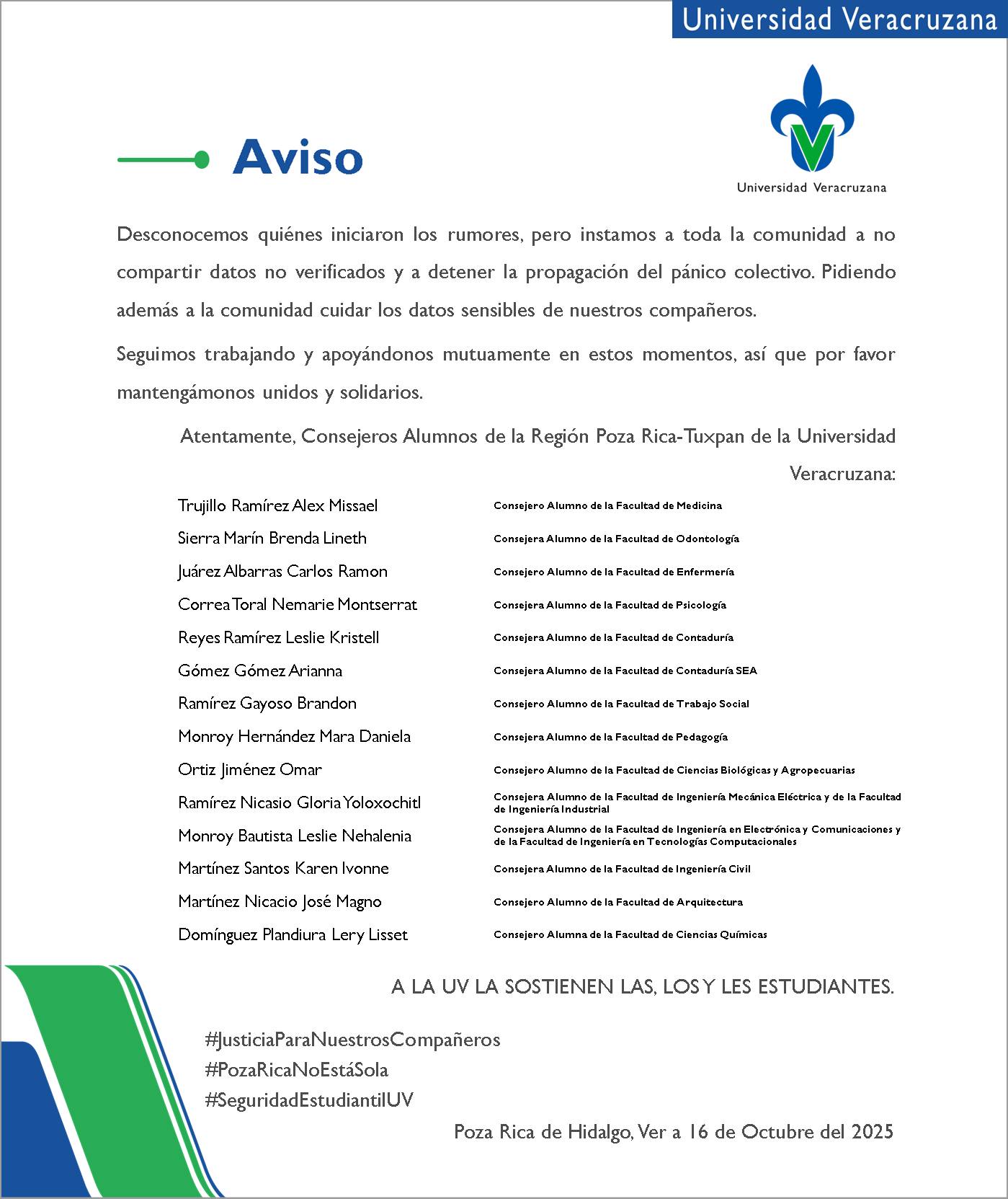 Ya este miércoles el rector Martín Aguilar había confirmado que la versión no era cierta… no le creyeron los jóvenes y tomaron instalaciones. Pero la noche de este jueves 16 de octubre, los Consejeros Alumnos Región Poza Rica-Tuxpan emitieron un COMUNICADO OFICIAL. Ya si ni a sus propios compañeros se les cree, ¿A quién?