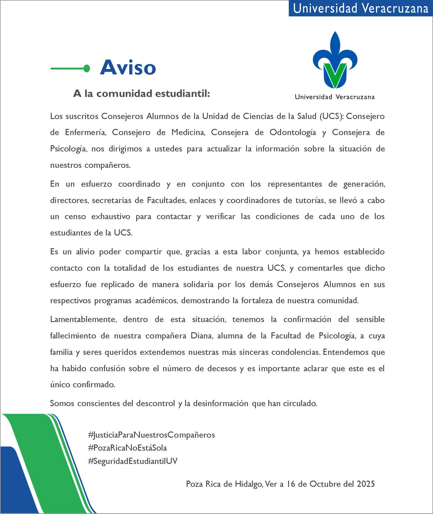 En memoria de nuestra compañera: Con profundo pesar, confirmamos el sensible fallecimiento de nuestra compañera Diana Jael Cuervo Santos, alumna de quinto semestre de la Facultad de Psicología. Extendemos nuestras más sinceras condolencias a su familia. Es importante recalcar que este es el único deceso confirmado.