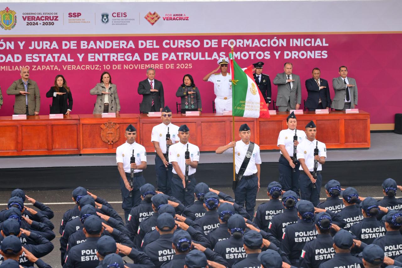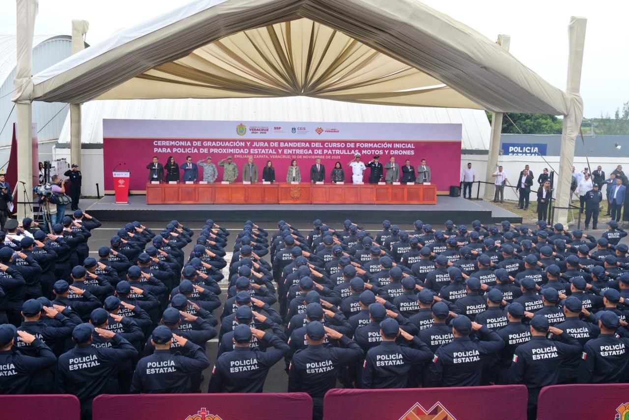 Xalapa, Ver., 10 de noviembre de 2025.- En representación de la LXVII Legislatura del Estado de Veracruz, la presidenta de la Mesa Directiva, diputada Naomi Edith Gómez Santos, acudió a la Ceremonia de Graduación y Jura de Bandera del Curso de Formación Inicial para Policía de Proximidad Estatal y Entrega de Patrullas, Motos y Drones, encabezada por la gobernadora de Veracruz, Rocío Nahle García. La inversión, que supera los 200 millones de pesos, fortalece las capacidades operativas de la fuerza policial e impulsa la Estrategia Estatal de Seguridad para mantener la paz en Veracruz. En este acto, al cual asistió la presidenta del Poder Judicial, magistrada Rosalba Hernández Hernández, así como los titulares de la secretarías de Gobierno (Segob), Ricardo Ahued Bardahuil, y de Seguridad Pública (SSP), Alfonso Reyes Garcés, además de mandos militares y navales, la legisladora Naomi Edith Gómez reconoció el trabajo de la gobernadora para proteger y servir mejor al pueblo veracruzano.