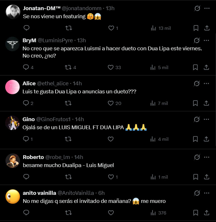 La publicación del cantante ya superó más de un millón de visualizaciones, reforzando la expectativa de que ambos artistas puedan coincidir en el escenario durante la última fecha de Dua Lipa en el país. Dua Lipa y su tradición de homenajes locales Como parte de su gira mundial, la intérprete ha incluido versiones locales en cada país que visita. En México no fue la excepción: El 1 de diciembre interpretó "Bésame mucho". En su segunda fecha sorprendió con "Oye mi amor" de Maná, acompañada por Fher Olvera. Esta dinámica también se replicó en otras ciudades del tour, con homenajes a artistas como Soda Stereo, Miranda!, Mon Laferte, Caetano Veloso, Carlinhos Brown, Shakira y Mauricio Mesones, entre otros. ¿Colaboración real o simple tributo? Aunque miles de fans sueñan con un dueto, ninguno de los dos artistas ha confirmado o desmentido la posibilidad. Algunos señalan que la publicación de Luis Miguel podría ser un reconocimiento a los arreglos de su versión de "Bésame mucho", mientras que otros creen que se trata solo de un gesto divertido hacia la visita de Dua Lipa a México.