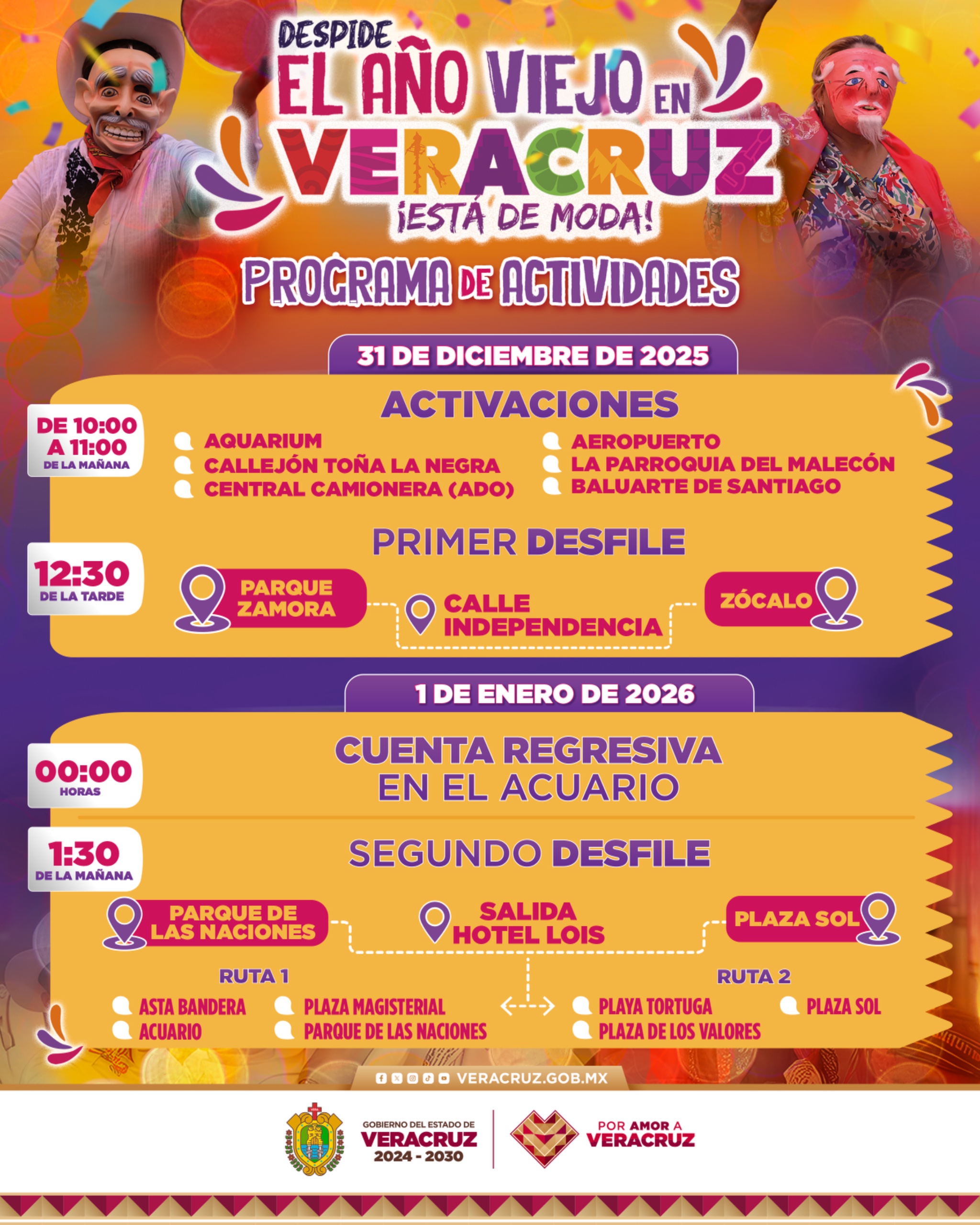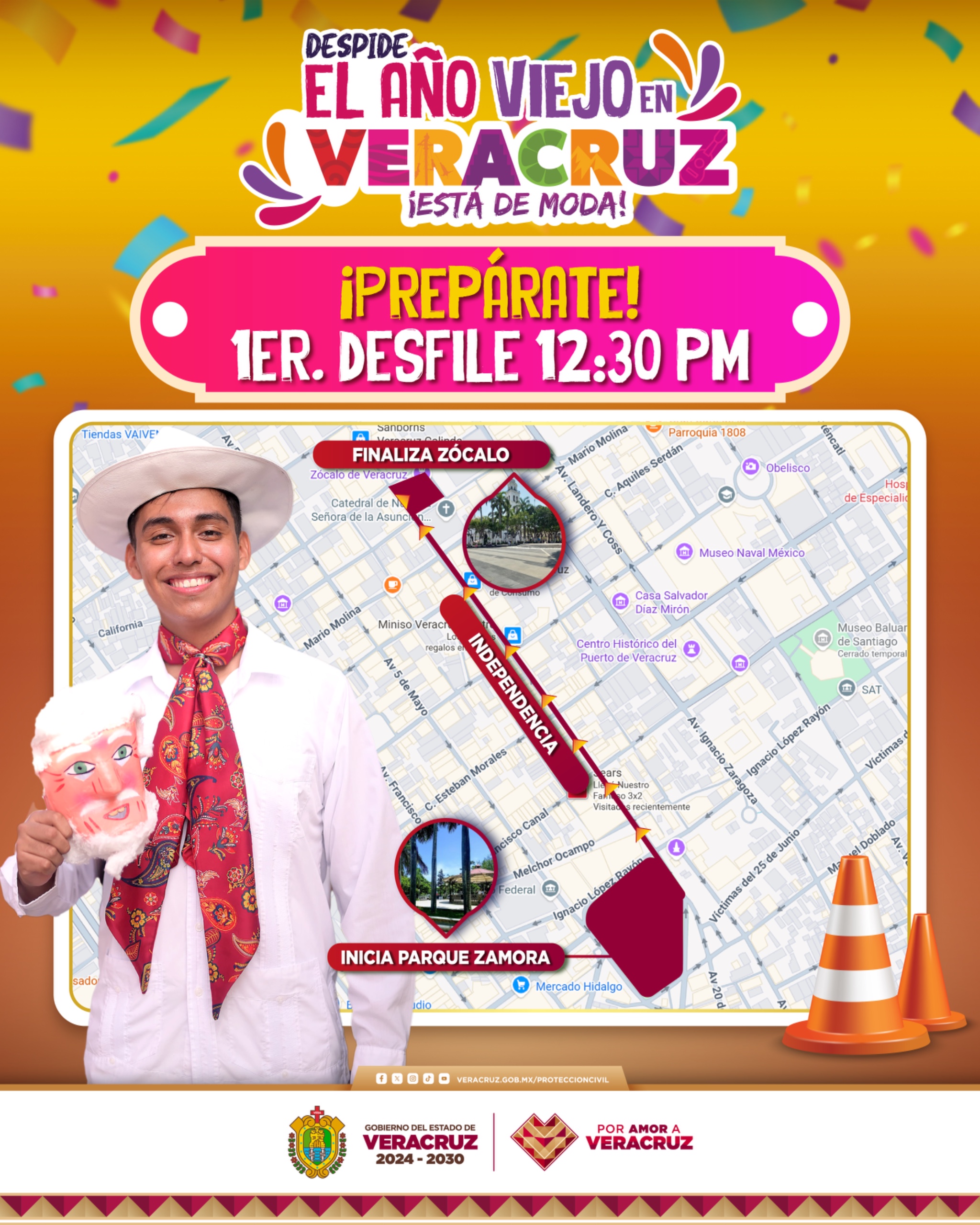 En punto de las 12:30 horas dará inicio el primer desfile Despide el Año Viejo en Veracruz; los contingentes partirán del Parque Zamora, avanzando sobre la calle Independencia, pasando frente al Zócalo de la ciudad para culminar sobre Montesinos.