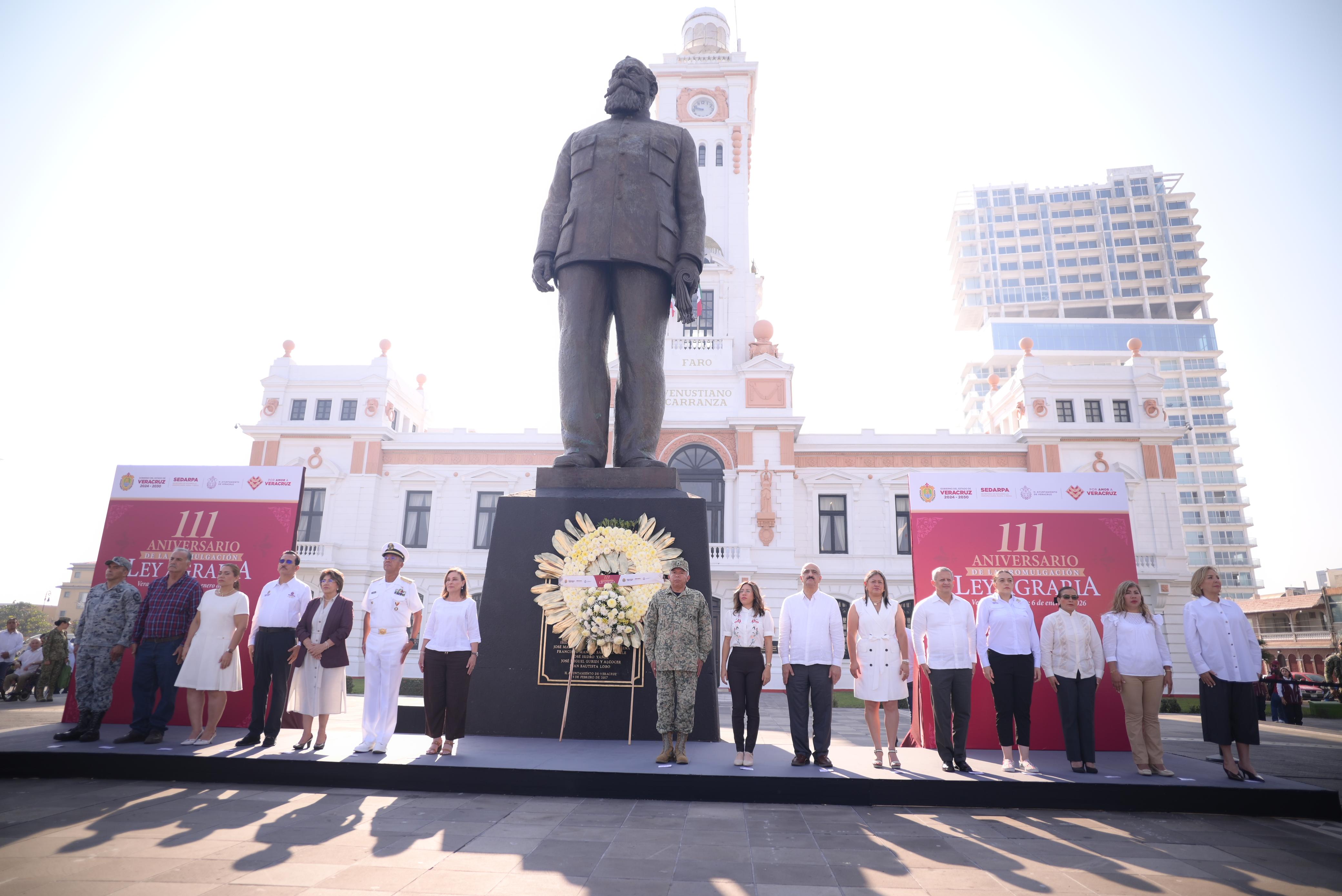 Veracruz, Ver., martes 6 de enero de 2026.– Con una guardia de honor y el depósito de ofrenda floral ante el monumento a Venustiano Carranza, la gobernadora Rocío Nahle García, junto con autoridades de los tres órdenes de gobierno, conmemoró el 111 aniversario de la promulgación de la Ley Agraria.