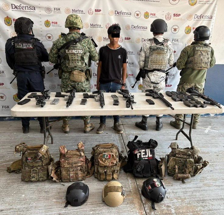 Por el delito de portación ilegal de armas de fuego, cuatro personas fueron detenidas, entre ellas un menor de edad, a quienes se les decomisaron seis armas de fuego largas y dos cortas, cargadores, cartuchos útiles, así como 11 dosis de presunto cristal, una motocicleta y una camioneta con reporte de robo.