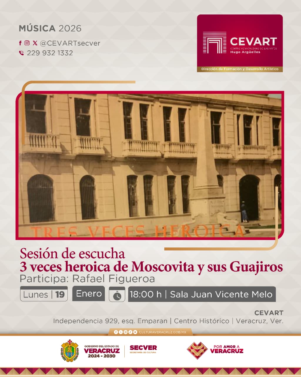 El lunes 19, a las 18:00 horas, se realizará la sesión de escucha denominada Tres veces heroica, de Moscovita y sus Guajiros, invitando a la reflexión en torno a esta pieza musical que celebra el título de la ciudad de Veracruz, con la participación de Rafael Figueroa, especialista en música popular veracruzana, particularmente en la música afroantillana y el son jarocho.